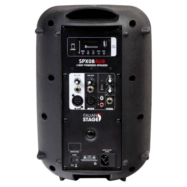 Altavoz de plástico bi-activo de 2 vías de 8”. – Reproductor multimedia: Unidad USB, Tarjeta Sd, Dispositivo Bluetooth, Control IR. – Woofer de 8”. – Conductor 1”. – SALIDA de línea XLR + JACK ¼”. – Entrada de línea XLR + 2 x RCA. – Mic IN XLR + JACK ¼”. – Potencia pico 300W. – Rango de frecuencia 60hz-20khz. – Spl pico 123 dB