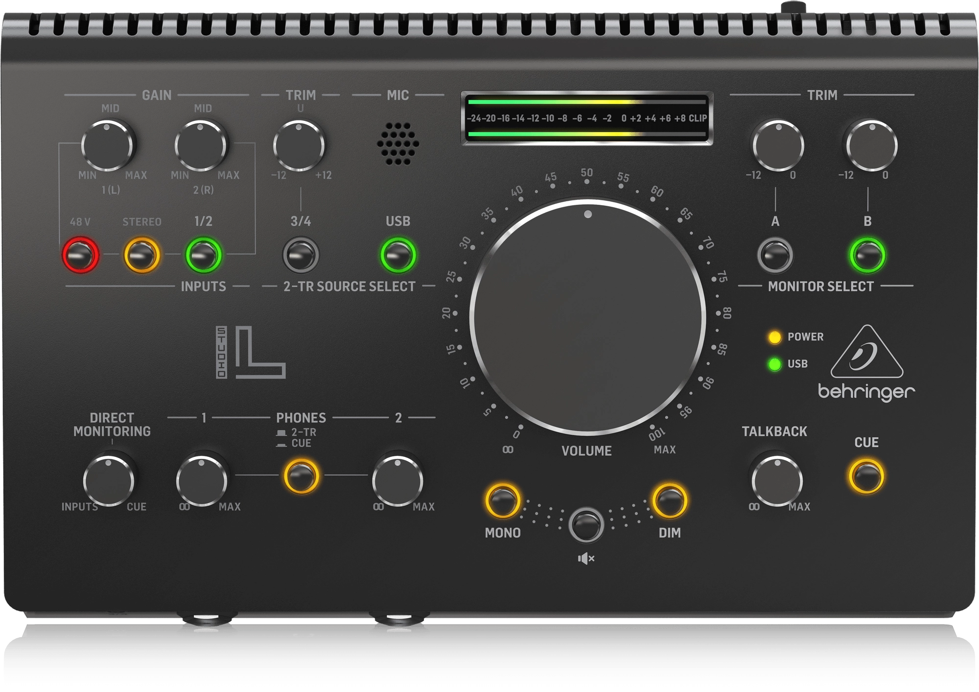 Centro de control y comunicación de estudio de alta gama con preamplificadores Midas, interfaz de audio USB 2×2 de 192 kHz y seguimiento estéreo VCA l STUDIO L – BEHRINGER