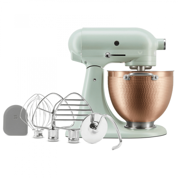Presentamos Blossom, una batidora de pie de la serie Design de KitchenAid®. Blossom lo invita a dejar que su creatividad florezca cada vez que se acerque a la batidora de pie. El suave color verde tomillo y los acentos botánicos están inspirados en las hierbas aromáticas y las flores comestibles que se usan para cocinar y hornear. El cuenco de cobre martillado desarrolla una pátina única con el tiempo, lo que refleja tu crecimiento como Maker.