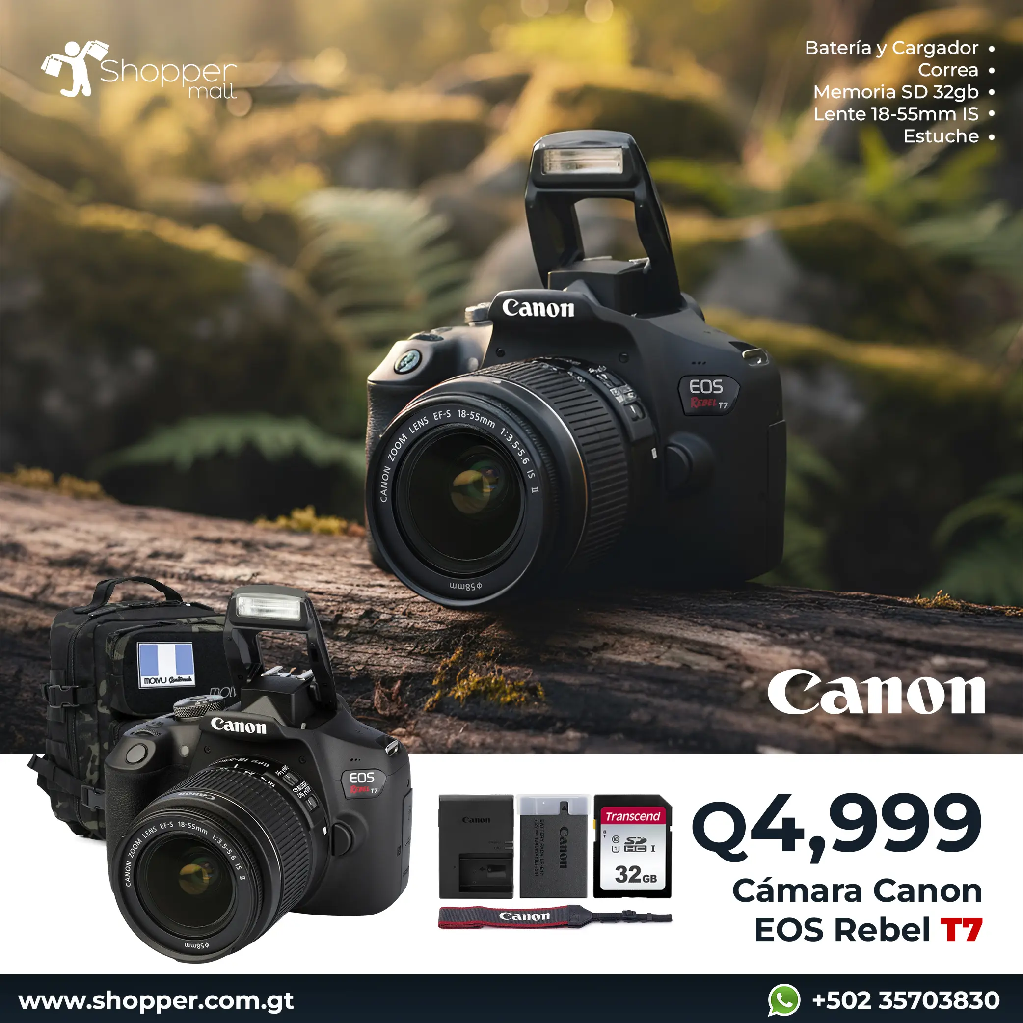 Ideal para usuarios de dispositivos móviles que desean dar el siguiente paso en su fotografía, la cámara EOS Rebel T7 combina fantásticas características con una operación sencilla de uso para obtener imágenes de alta calidad que usted compartirá con orgullo. Aproveche la capacidad del gran sensor CMOS de 24.1 megapíxeles de la EOS Rebel T7 para desarrollar su potencial y obtener excelentes fotografías. Comparta sus recuerdos con familiares y amigos fácilmente y de una manera rápida a través de las tecnologías Wi-Fi®* y NFC** integradas. Con el rápido sistema de enfoque automático de la EOS Rebel T7, usted puede capturar cada momento al instante, visualizando cada toma a través del luminoso visor óptico. Una variedad de características adicionales, que incluyen una pantalla LCD grande, la grabación de videos en alta definición real (Full HD) y una guía de características integrada, le ayudan a capturar fotografías y videos llamativos.