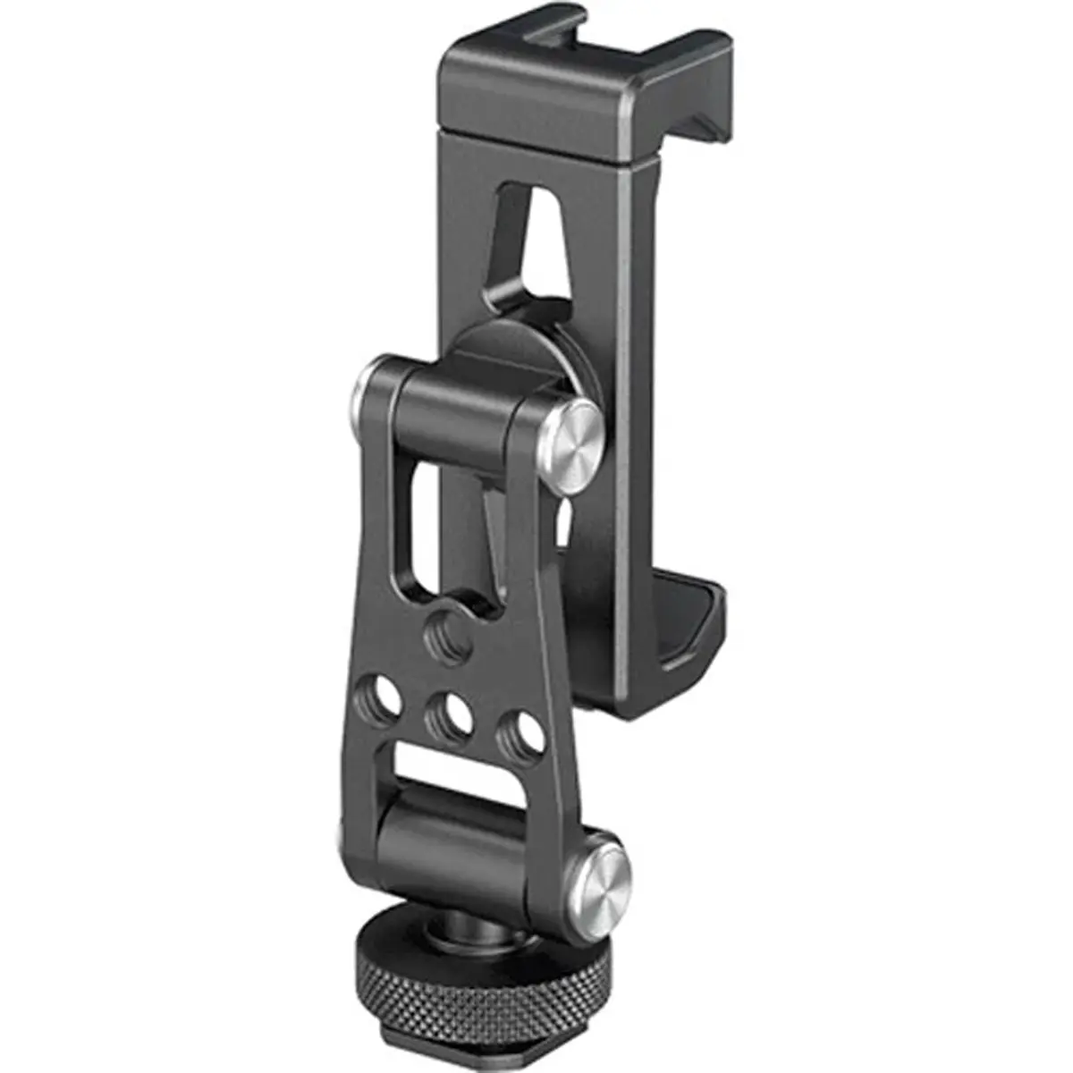 Las mordazas ajustables del soporte son compatibles con todos los smartphones comunes, soportan hasta 0,5 kg y pueden girarse vertical u horizontalmente. También se puede montar en soportes de 6,35 mm-20, como minitrípodes, monópodes o rótulas, utilizando una rosca estándar de 6,35 mm-20 en el adaptador de zapata.