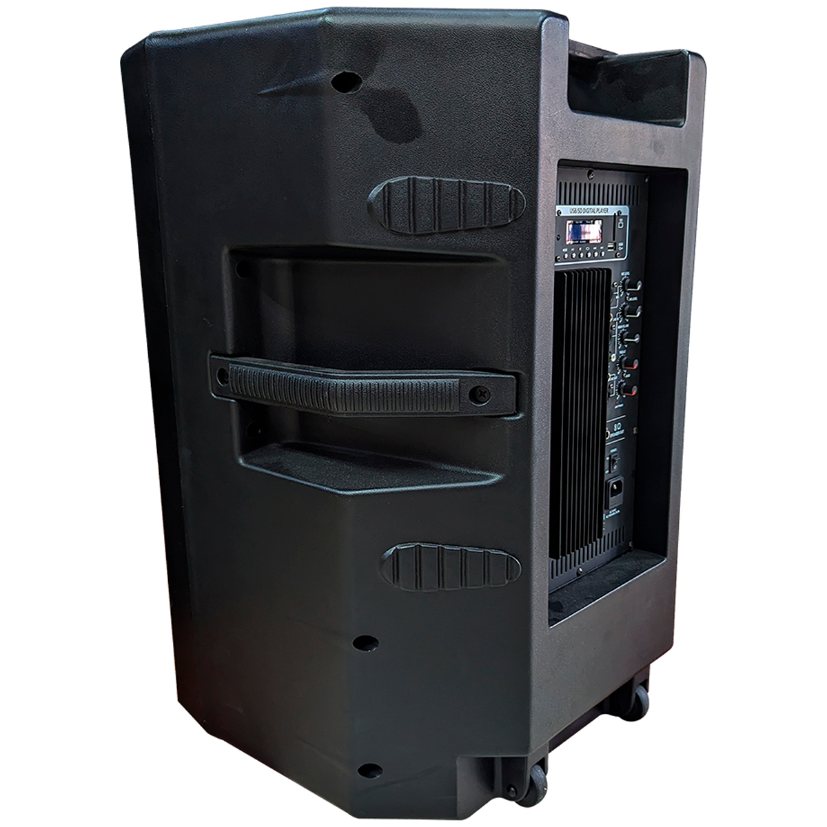 Bocina Activa de 2 vias Woofer de 18″ Driver 25mm Potencia nominal: 500 Watts Amplificador Clase-AS Respuesta de frecuencia: 60Hz-20KHz Sensibilidad: 92dB Impedancia: 8 ohm Entradas: RCA – XLR / Línea Reproductor USB Ruedas y Agarraderas ergonómicas para un fácil transporte