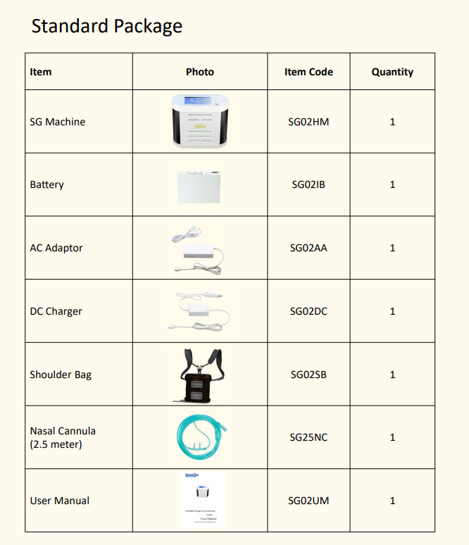 - El concentrador funciona segun el principio de separacion de oxigeno, que separa el oxigeno del aire circundante y lo suministra al paciente en alta concentracion. Como resultado, el SG02L garantiza una oxigenoterapia optima en diferentes entornos, ya sea en casa, caminando o viajando en coche o avion.