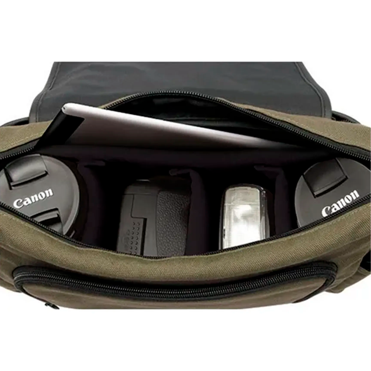Almacena y protege tu cámara con 1 o 2 lentes y varios accesorios en este estuche verde CB-MS12-GR-BP de Canon. El estuche de mensajero de Canon está fabricado en material de lona de algodón, puede acomodar 1-2 cuerpos de cámara y 1-2 lentes o accesorios. El espacio interior te permitirá efectuar ajustes a fin de lograr el tamaño según sea necesario para mantener la cámara y los accesorios separados. El estuche también cuenta con cuatro bolsillos externos separados para poder guardar algunas otras pertenencias.