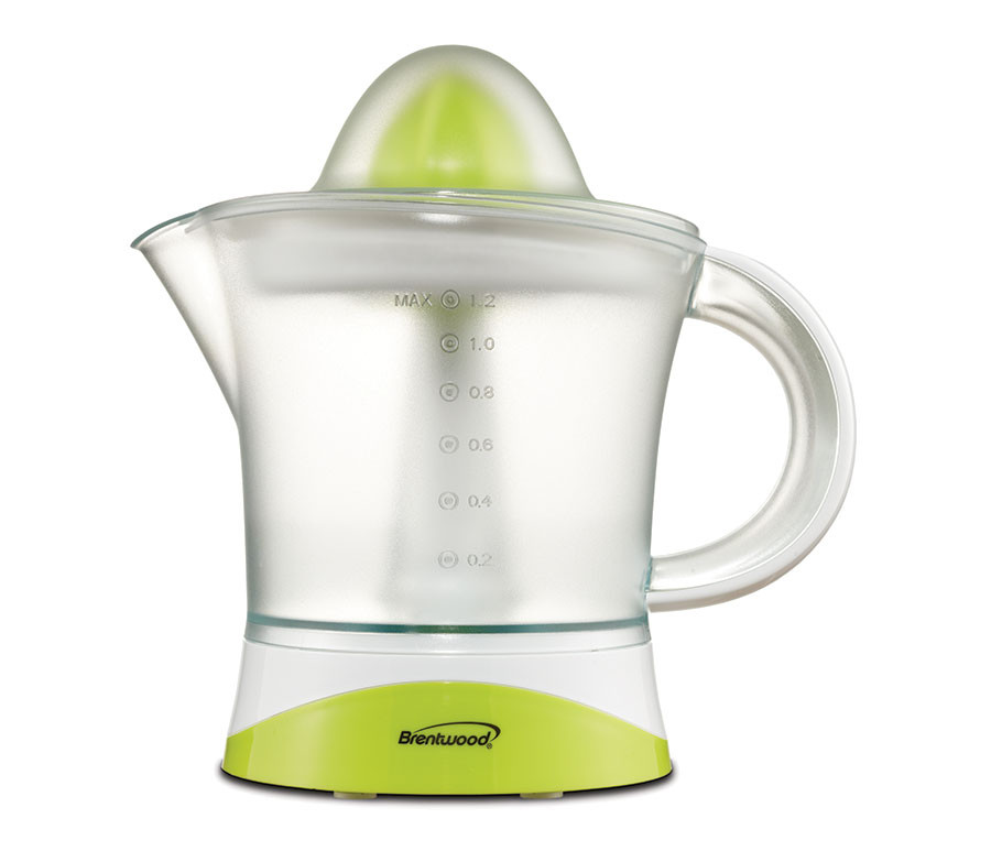exprimidor de citricos electrico Brentwood de 40 oz. Jugo de naranjas, limones, limas y mas. El cono de inversion automatica extrae la maxima cantidad de jugo. La jarra de vision clara se levanta de la base para servir de inmediato. Las piezas extraibles se pueden lavar en el lavavajillas.