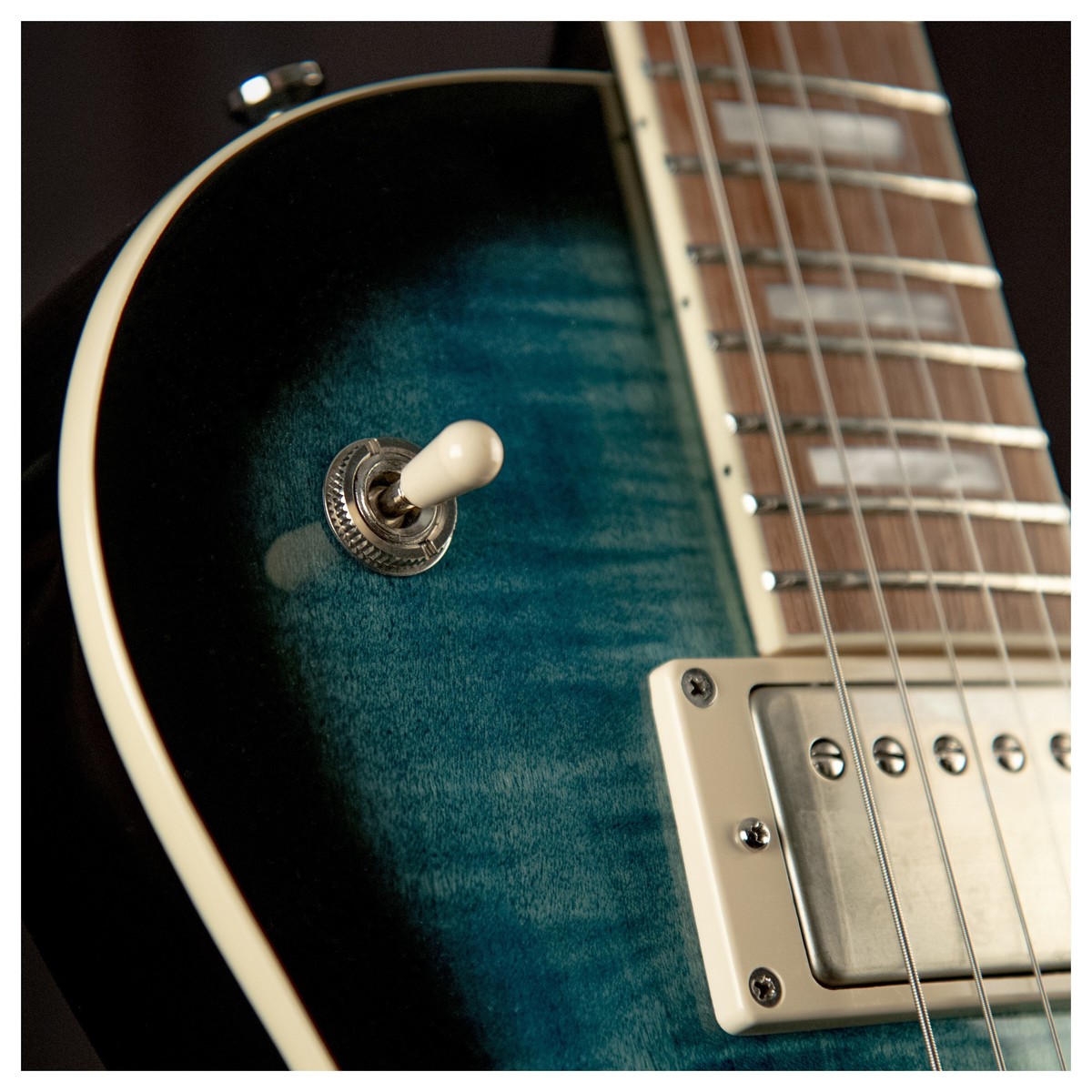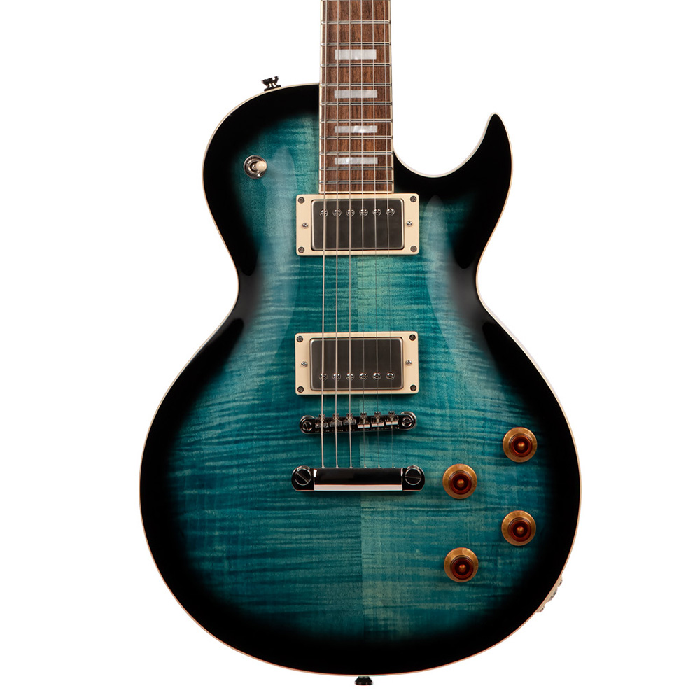 • Cuerpo: Madera de caoba, con tapa arqueada de arce atigrado (flamed Maple), y ribetes de color marfil.
