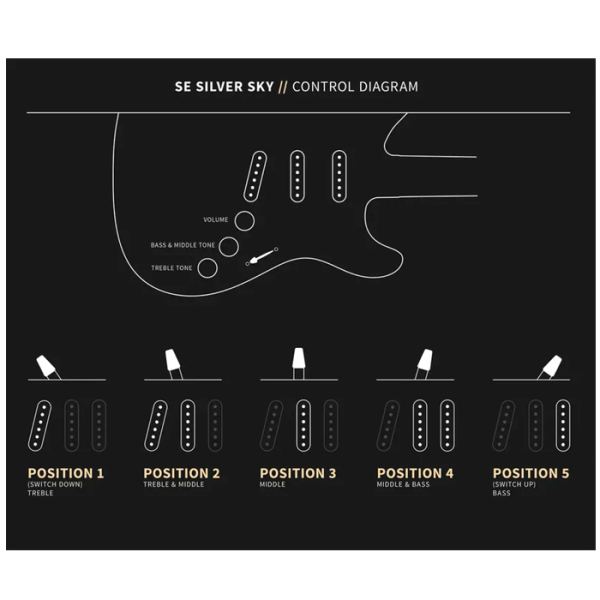 La PRS SE Silver Sky es una iteración familiar del modelo Silver Sky original que se presentó por primera vez con John Mayer en 2018. Esta guitarra proporciona un amplio tono y capacidad de ejecución, brindando apariencia, sensación y sonido. La PRS SE Silver Sky comienza con un cuerpo de álamo, un mástil de arce atornillado y un diapasón de palisandro con incrustaciones de pájaros de la marca PRS. El mástil de 22 trastes y 25,5 “de longitud de escala presenta la talla original 635JM y un radio de diapasón de 8,5”, por lo que el PRS SE Silver Sky se sentirá como en casa. Conéctelo y las tres pastillas 635JM “S” de bobina simple ladrarán y cantarán. Esta guitarra está anclada por un trémolo de acero de dos puntos, cejilla de hueso sintético y afinadores de estilo vintage.