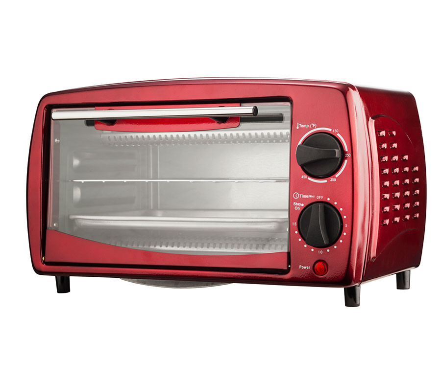 Horno tostador de 4 rebanadas de rojo de 800w puede tostar, asar y hornear una gran variedad de alimentos. Rangos de temperatura ajustable de 50 a 450 grados.