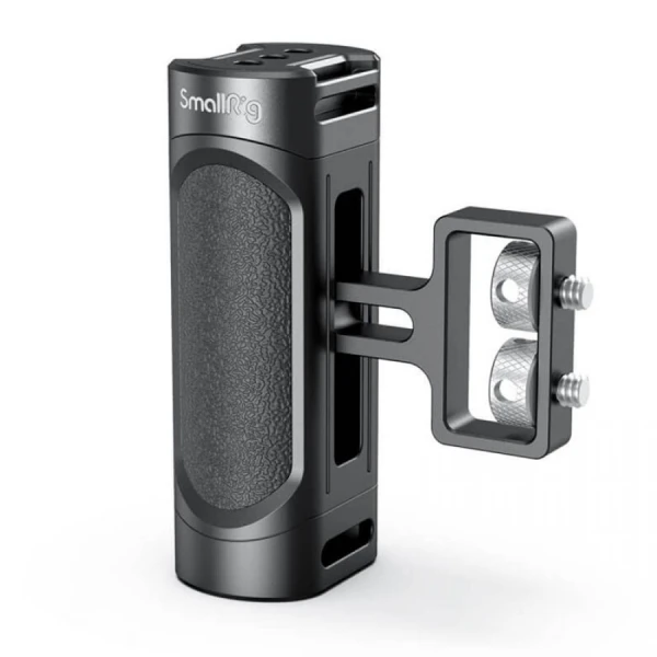 El mango lateral pequeño 2916 de SmallRig con tornillos de 1/4”-20 está diseñado para cámaras digitales sin espejo y otras cámaras pequeñas. Se fija con dos tornillos de 1/4”-20 al costado de la jaula. El asa admite opciones de montaje adicionales: el flash y el micrófono se pueden montar a través de la zapata fría y la correa para la muñeca, como la 2456 (se vende por separado), se puede montar a través del ojal para evitar que la cámara se caiga accidentalmente. Altamente ajustable para adaptarse a diferentes alturas de jaula y admitir el cambio rápido de zurdos a diestros a través de la llave incorporada.
