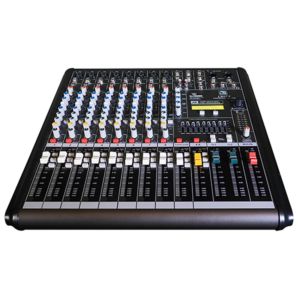 8 Canales XLR/Line/insert 1 Canal de control de efecto 1 Canal de control para entrada Tape/USB 2 Canales de grupo asignable salida estéreo o izquierdo/derecho Amplificador por canal y entrada de Tape/USB Ecualizador de cuatro bandas por canal Envío por canal a Grupo 1 o 2 Envió por canal a canal de efectos Envío/Retorno a control auxiliar Asignacion de salida izquierdo/derecho por canal Ecualizador gráfico de 9 bandas Control de salida y retorno de auxiliar Asignacion de salida izquierdo/derecho por canal 29 tipos diferentes de efectos ajustables Reproductor USB de los formatos MP3 – WAV – WMA – Flac Salida estéreo de audífonos Entradas y salidas RCA Indicador gráfico de volumen de salida Salida general XLR y Línea