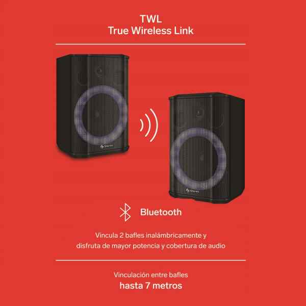TWL (True Wireless Link): ¡Obtén una gran experiencia de audio gracias a la tecnología TWL! Vincula 2 bafles por Bluetooth para tener mayor potencia y cobertura de sonido. Olvídate de los cables y disfruta de toda tu música de una forma envolvente, además controla toda la reproducción desde un solo dispositivo móvil. La distancia máxima del enlace entre ambos bafles es de hasta 7 metros.