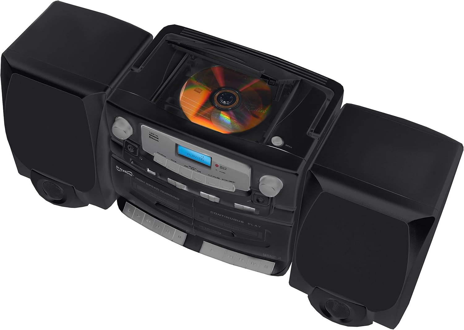 • Sistema de musica de audio portatil multimedia vintage – Carga superior CD/MP3 Radio AM/FM Entrada USB incorporada Compatible: Reproducir dispositivos multimedia como unidades flash y reproductores de MP3 Grabadora de casete doble grabacion de CD, radio o microfono incorporado Microfono incorporado Memoria de pista programable