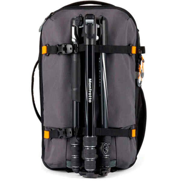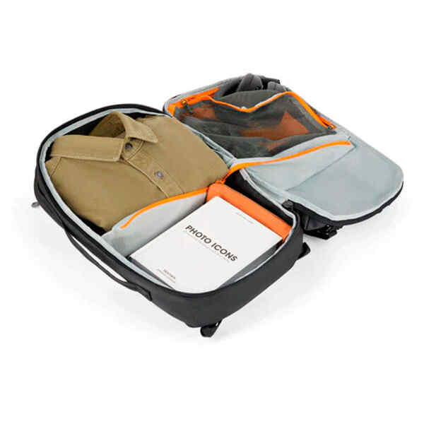 La mochila acepta cámaras como una Sony Alpha 6000 o similar con una lente adjunta, además de dos lentes pequeñas adicionales o un cargador y una batería. Alternativamente, puede contener un pequeño dron como un DJI Mavic Air 2. Hay una funda para una computadora portátil de 13″ y espacio para un trípode pequeño y artículos personales adicionales.