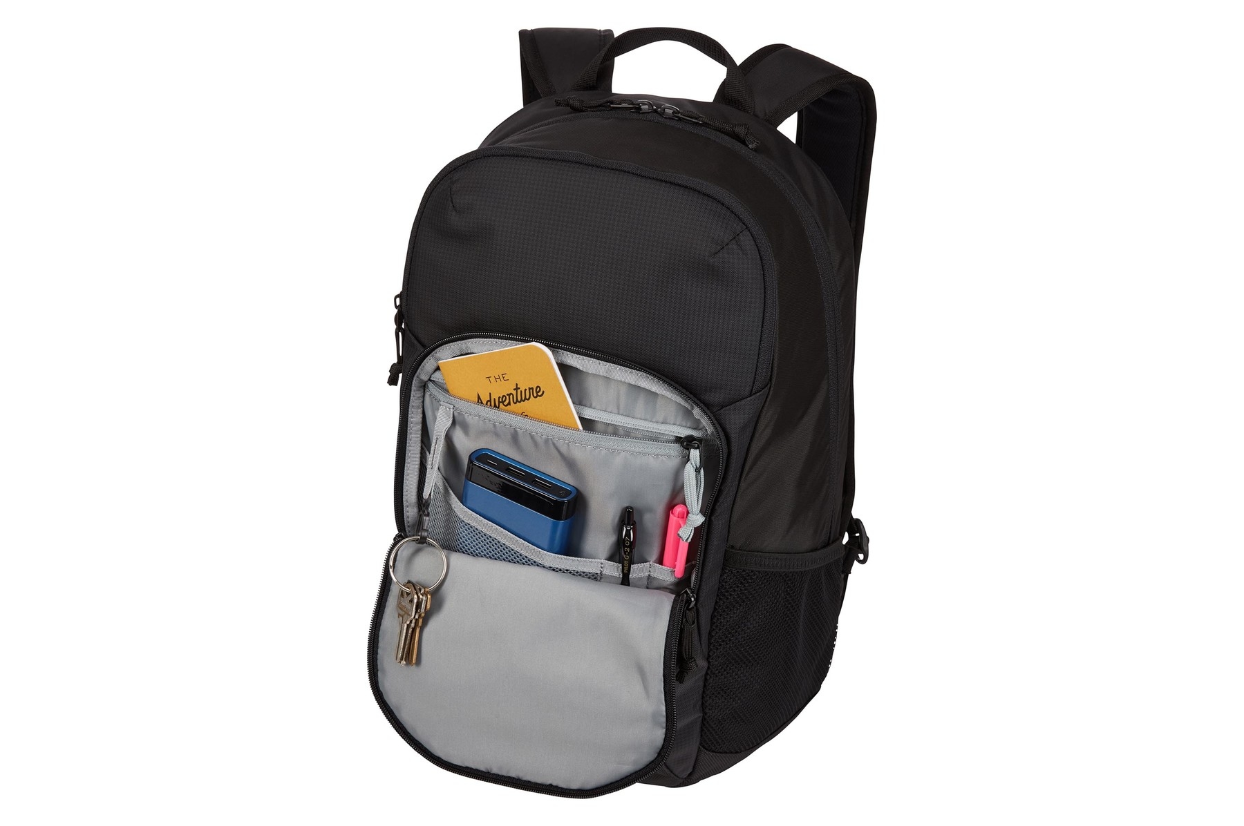 - Organiza pequeños artículos electrónicos y accesorios en un bolsillo de acceso rápido con compartimento con cremallera, bolsillo de malla, almacenamiento para lápiz y correa para llaves