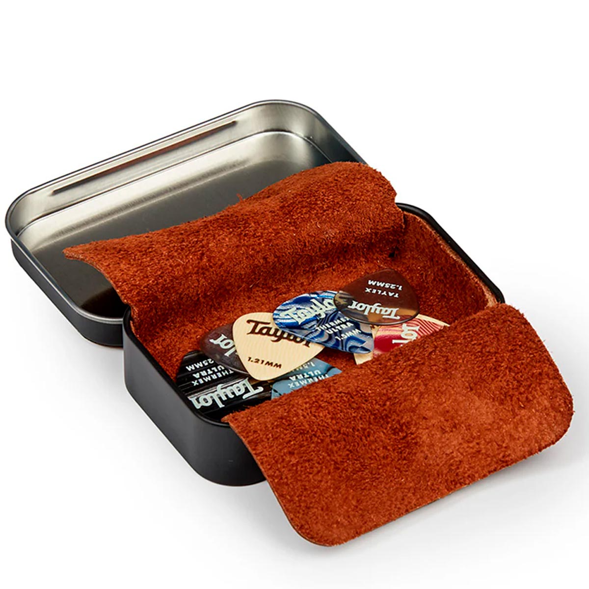 Desde que se introdujo la púa de guitarra tal como la conocemos en 1922, los guitarristas han elegido sus púas casi exclusivamente en función de su función y sensación. Taylor ha repensado cada aspecto del diseño de púas para estas púas de guitarra de la serie DarkTone, ofreciendo a los instrumentistas una gama más amplia de colores musicales con nuevos materiales que enfatizan diferentes partes del rango de frecuencia. Este paquete de muestra incluye una púa de cada familia DarkTone, con diferentes tamaños y materiales para que puedas experimentar con la variedad de texturas sonoras que tu guitarra puede producir. Pruebe estas selecciones para mejorar el tono y escuche lo que se estaba perdiendo. Este paquete de púas DarkTone de edición de coleccionista presenta una tapa de madera de koa hawaiana genuina y un forro de cuero marrón clásico. Tan funcional como hermosa, esta lata de púas es una adición sorprendente a cualquier espacio donde hagas música. Modelo # 2601