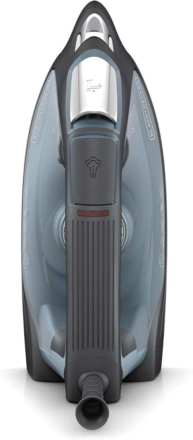 - Suela de acero inoxidable: la suela duradera se desliza facilmente sobre todos los tipos de tela, y cuenta con una punta estrecha para un planchado preciso alrededor de botones y collares