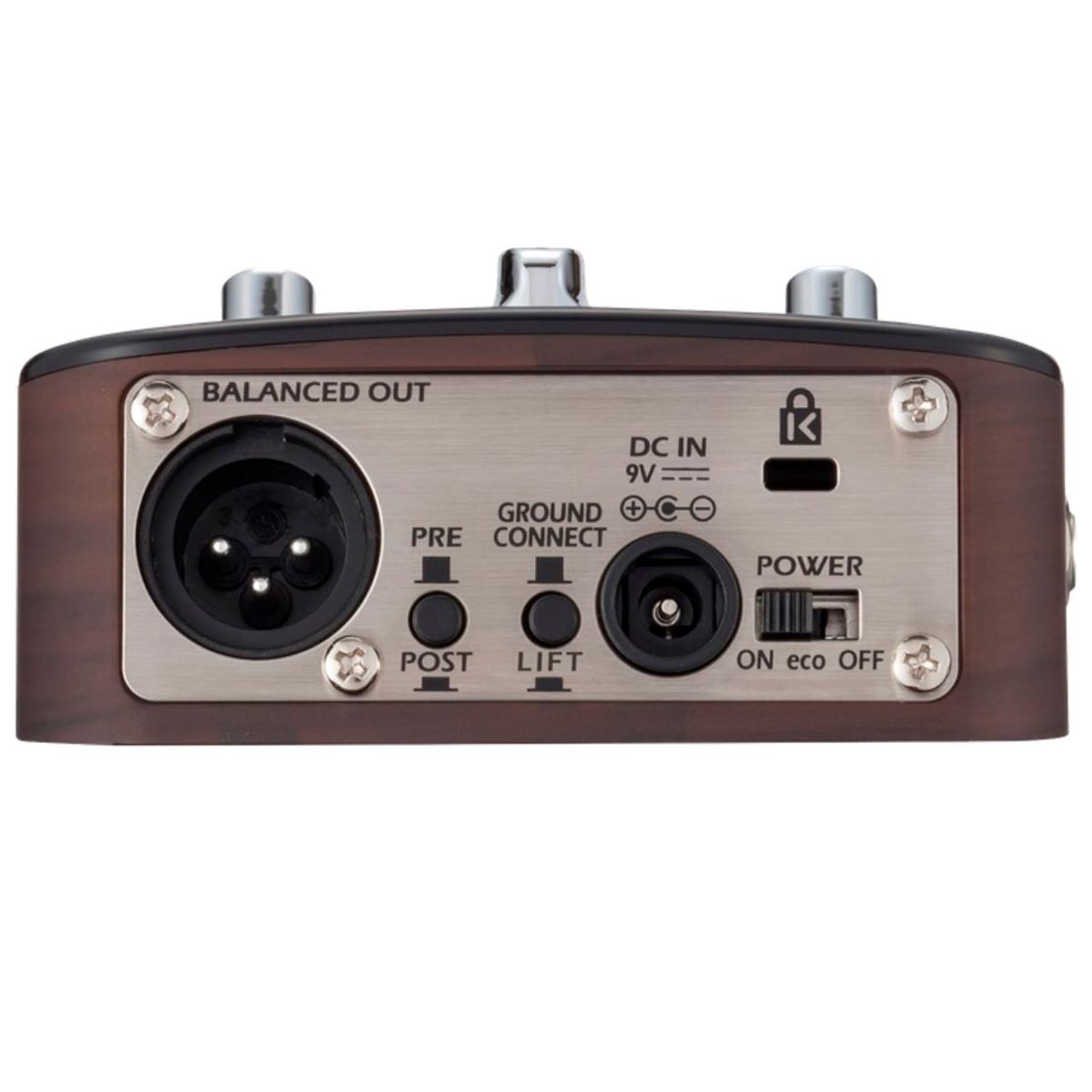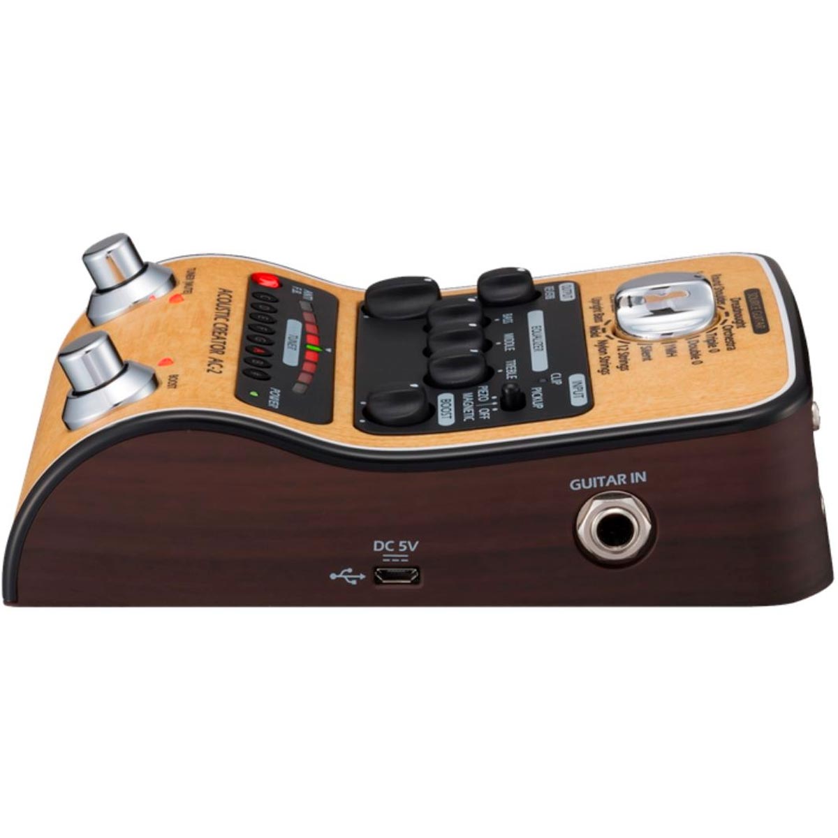 El AC-2 es una DI (caja directa) que incluye todo lo necesario para amplificar el sonido acústico de tu guitarra tanto en escenario como en estudio. Este preamplificador especialmente diseñado restaura automáticamente las pérdidas de sonido a través de las pastillas acústicas, haciéndolo siempre exuberante, resonante y fiel al instrumento del que procede. Con AC-2 el músico tendrá un control preliminar sobre su sonido antes de enviarlo al mezclador o a su amplificador personal. Con 16 preajustes de guitarra fuente, el AC-2 puede recuperar las características sonoras de una variedad de tipos de guitarra acústica. Puedes elegir entre dreadnought, contrabajo, cuerdas de nailon, 12 cuerdas y más. Diseñado para funcionar tanto en estudio como en escenario, el Acoustic Creator AC-2 viene en un práctico formato stompbox con salida balanceada junto a los botones ground-lift, para decidir si la señal debe tomarse antes o después del ecualizador de sección. Además de la entrada de instrumento, el chasis dispone de dos jacks para conectar dos amplificadores en estéreo o para utilizarlo como salida de auriculares. Útil para improvisar y tocar en la carretera, puede alimentarse con la fuente de alimentación de 9 voltios incluida, con un puerto USB de 5 voltios (también útil para actualizaciones de firmware) o con un par de baterías AA para una autonomía de 3 horas.