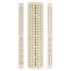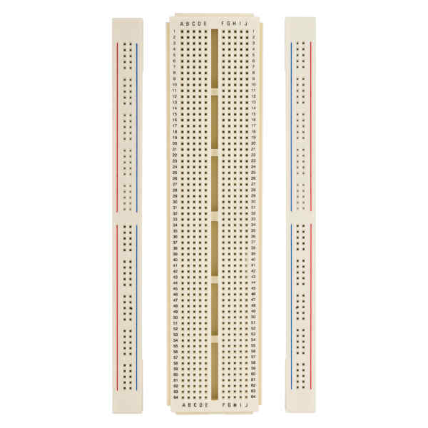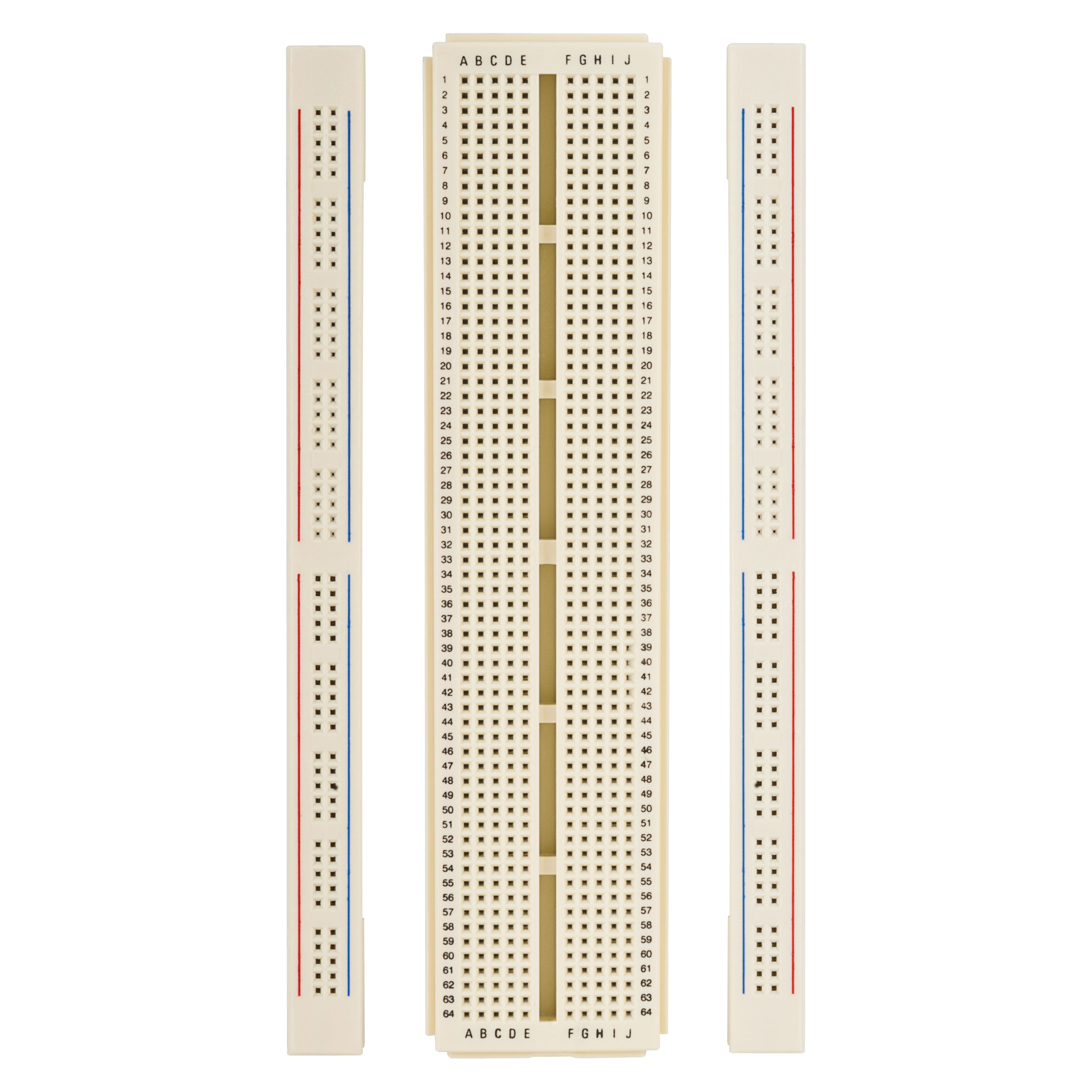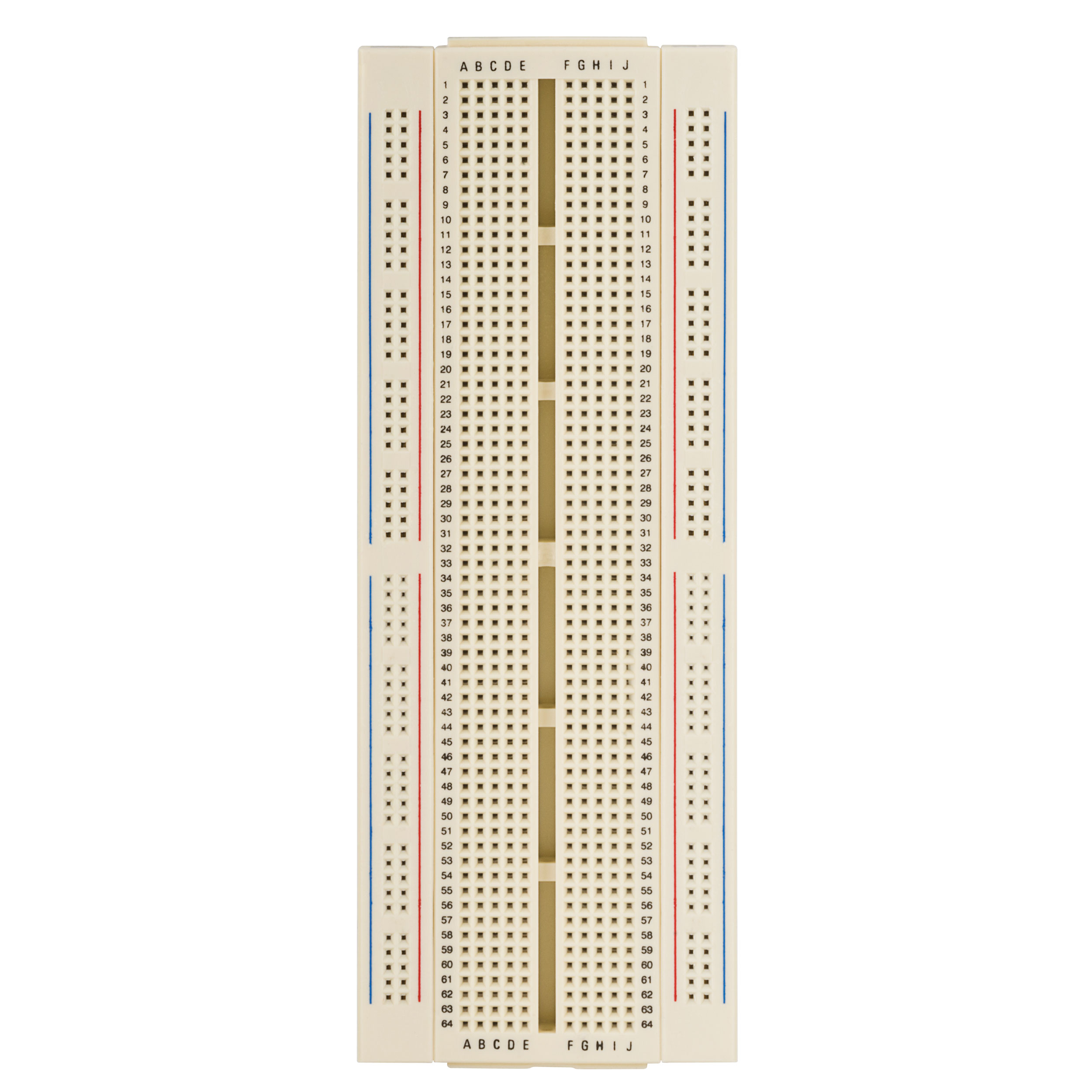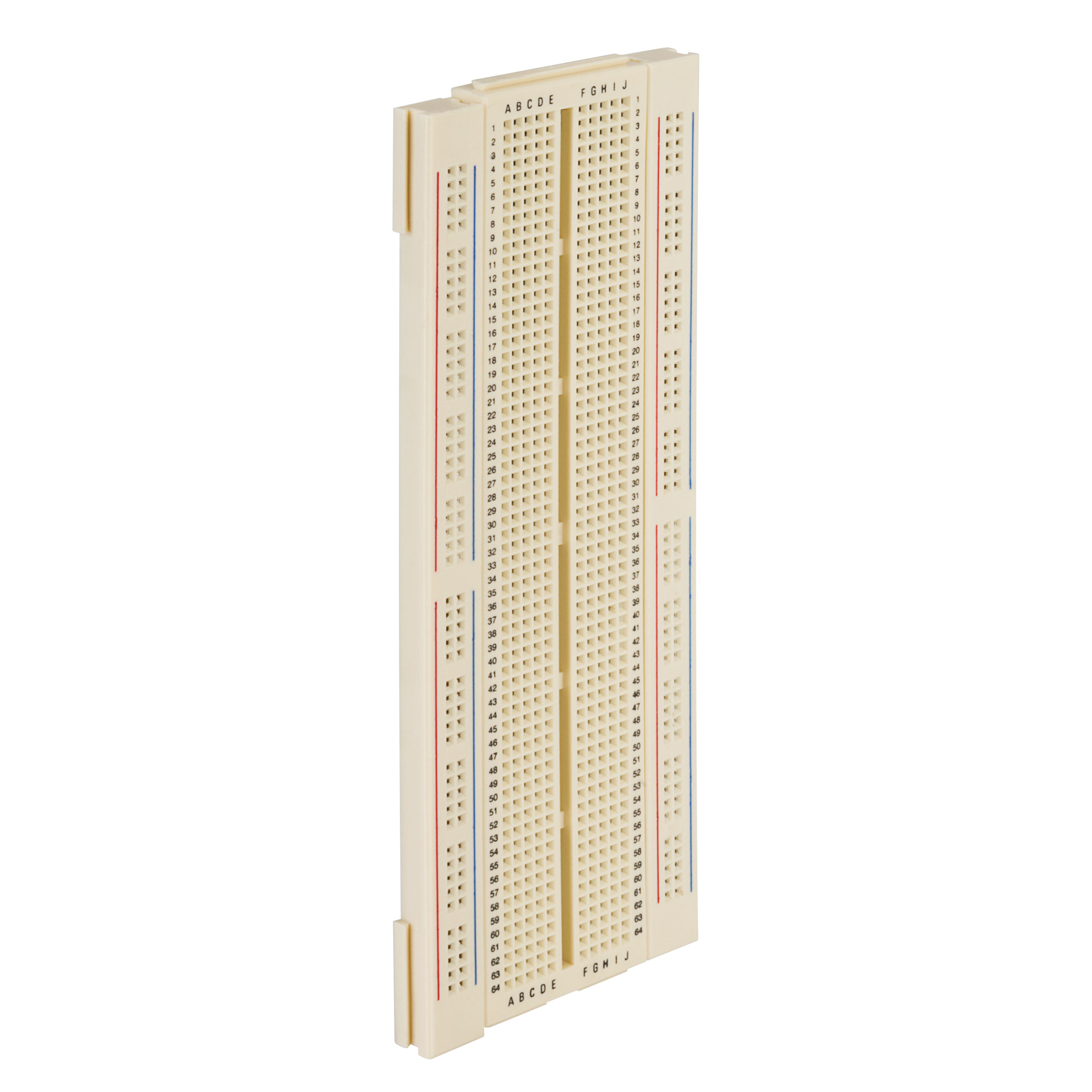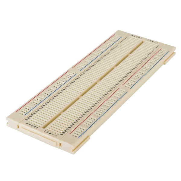 Tablilla de conexión (Protoboard), con 1 bloque, 2 tiras, sin bornes y 830 perforaciones. Mide 6,4 x 17,2 cm; útil para armar prototipos de circuitos electrónicos.