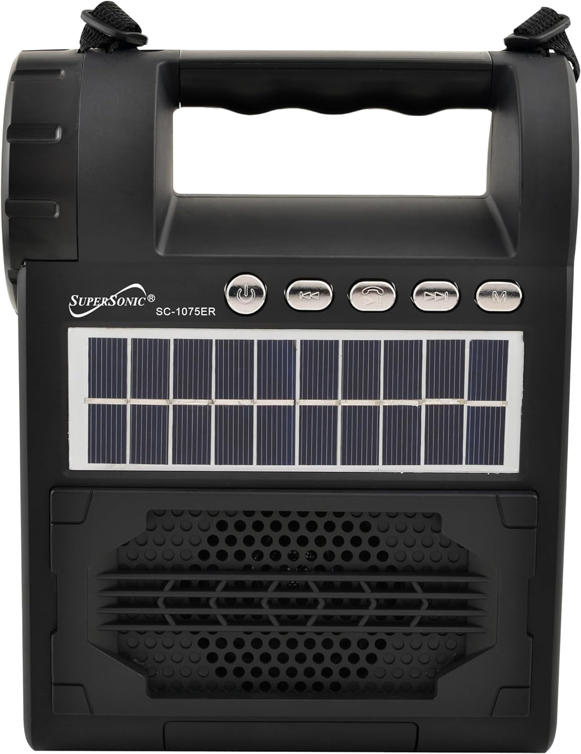Radio linterna con Bluetooth de energia solar con radio FM, linterna y linterna, antena de 360°, linterna, linterna, entrada auxiliar USB/SD/0.138 in, bateria recargable y panel solar.
