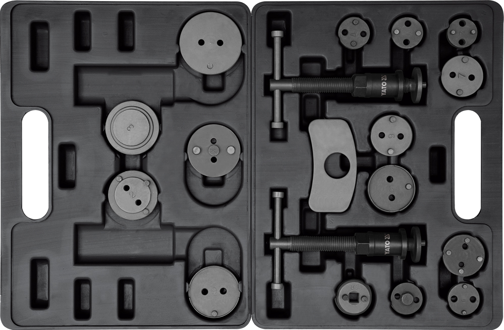 Juego profesional de 18 piezas de separadores de pinzas de freno manuales. Aplicación Un set profesional para desmontar los pistones de freno. El dispositivo consta de dos prensas de tornillo, para diestros y zurdos, y un juego de placas que permiten la sustitución de pistones en una amplia gama de coches. Diseñado para automóviles: Citroen; Alfa Romeo; Audi; BMW; Honda; Jaguar; Mitsubishi; Nissan; Toyota; VW; Subaru; Rover, GM, Peugeot, Renault, Mazda. Un conjunto diseñado para satisfacer las necesidades de los servicios mecánicos y automotrices especializados.