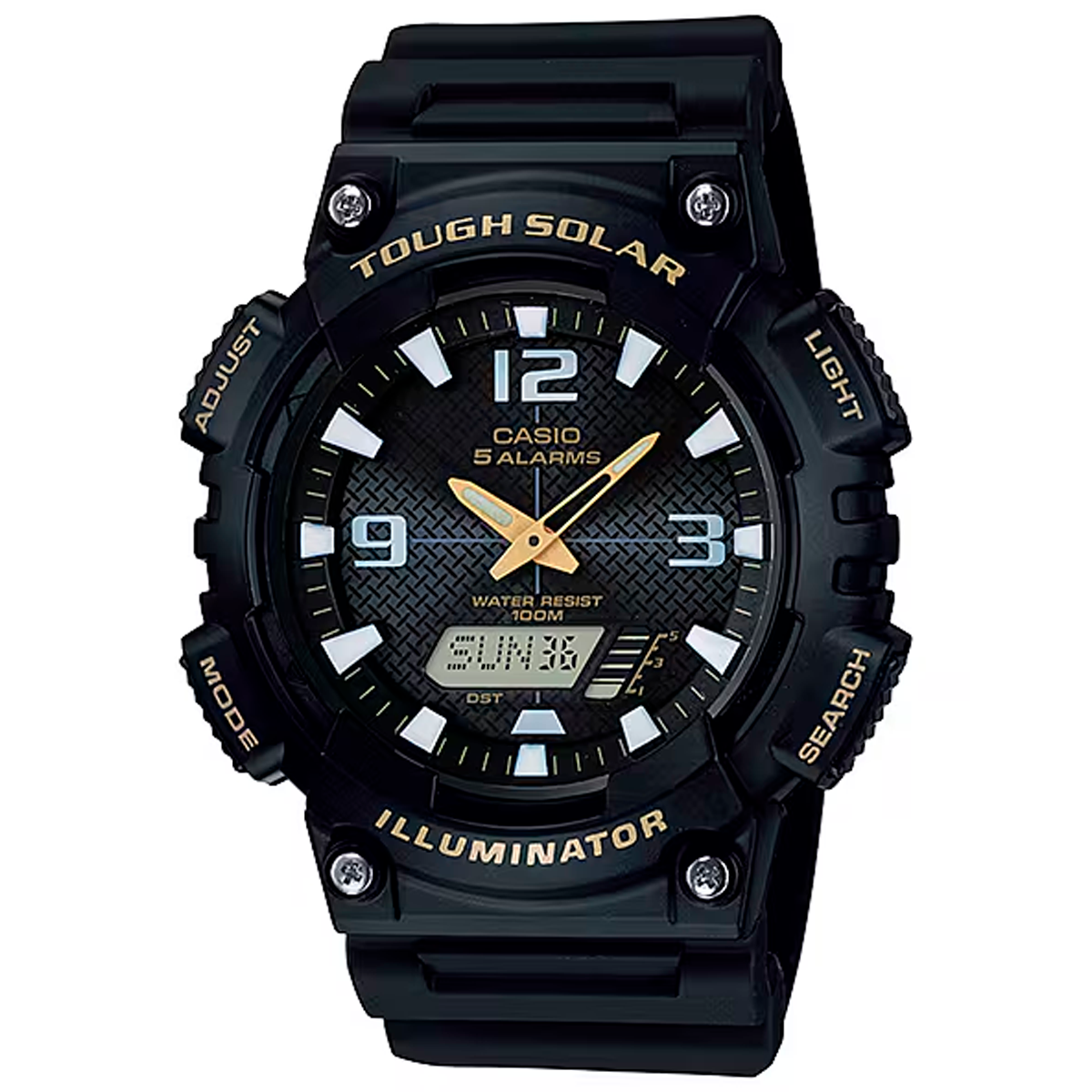 CASIO DE ENERGÍA SOLAR • Tough solar • Hora mundial • Cronómetro de 1/100 segundos • 5 alarmas • Luz LED (solo la parte LCD) • Resistente al agua hasta 100 metros • Diseño deportivo • Indicador del día de la semana en 6 idiomas (inglés, portugués, español, francés, alemán, italiano)