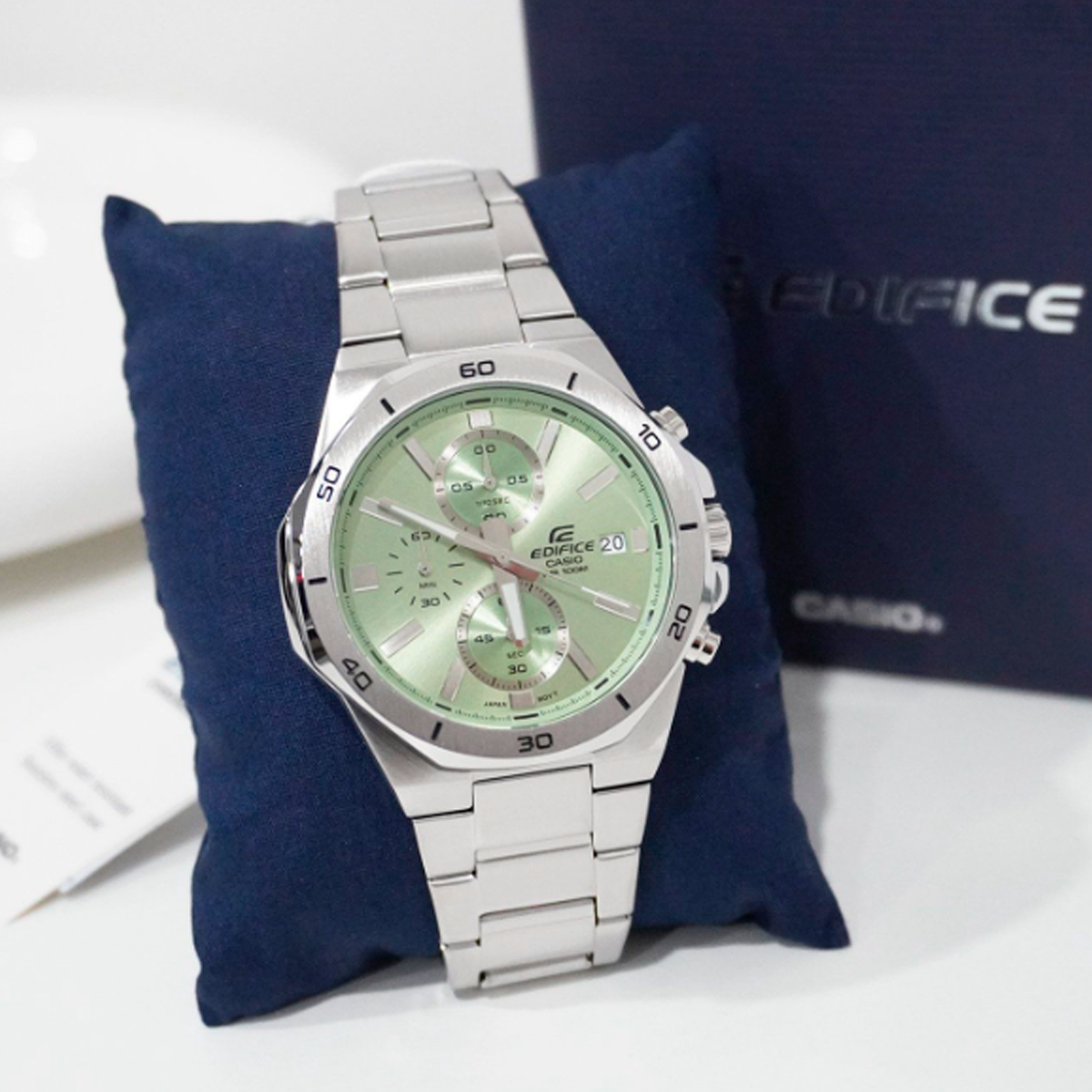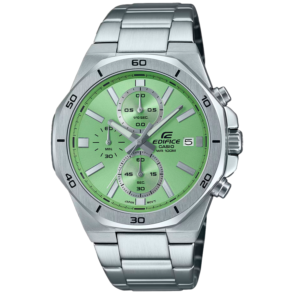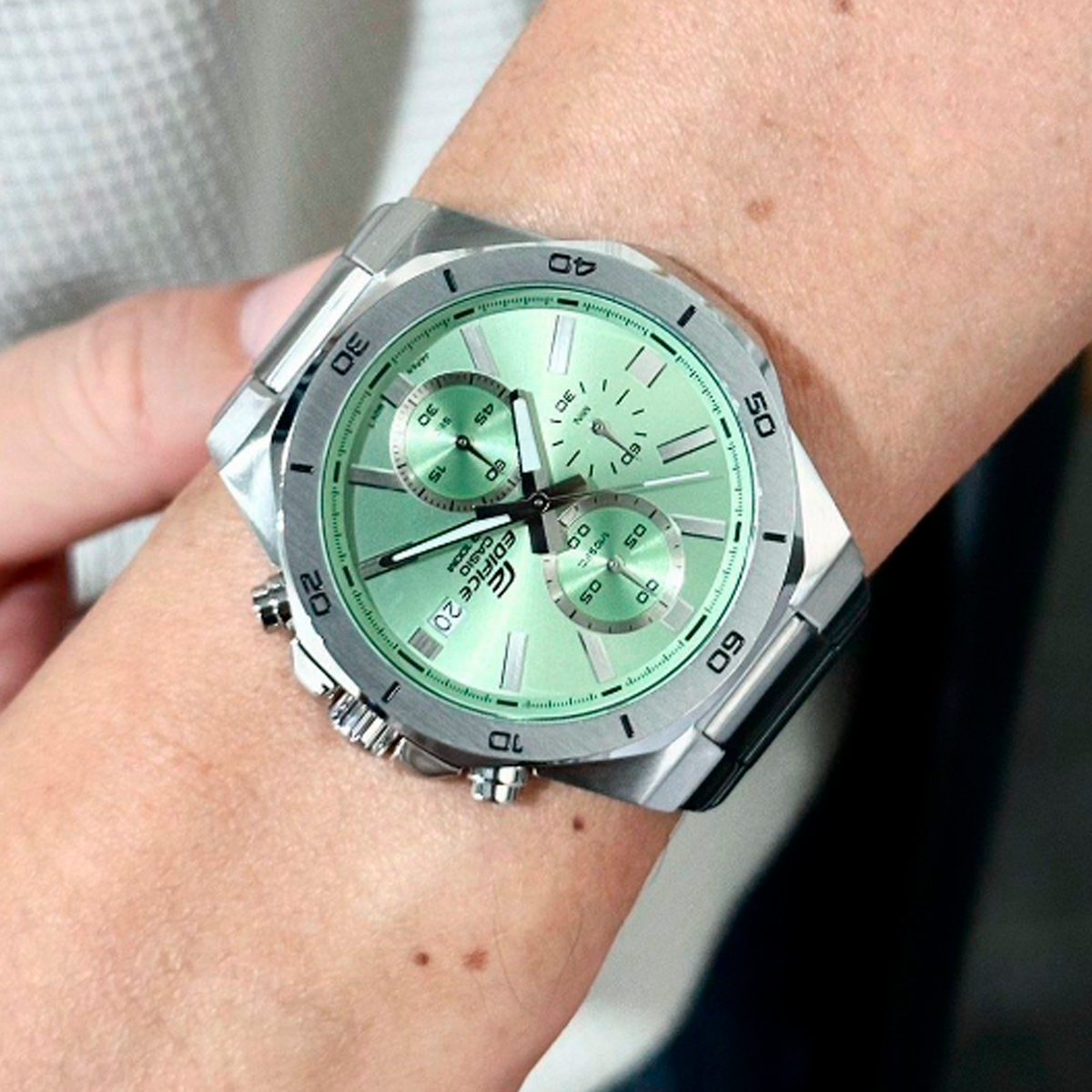 El EFV-640D-3A presenta un estilo clásico con esencia deportiva. Diseñado para el uso diario con un aire urbano, combina practicidad y sobriedad con detalles deportivos bien definidos. Lleva un clásico renovado con un toque de color, y disfruta de la combinación perfecta de sofisticación y simplicidad en este cronógrafo deportivo, diseñado para resistir hasta 10 bares de presión bajo el agua. El bisel octogonal presenta una superficie frontal plana pulida con un acabado fino, que contrasta elegantemente con sus laterales de acabado espejo. Este juego de texturas se complementa con una esfera en tonos suaves pero vibrantes, añadiendo un toque de estilo distintivo a tu muñeca.