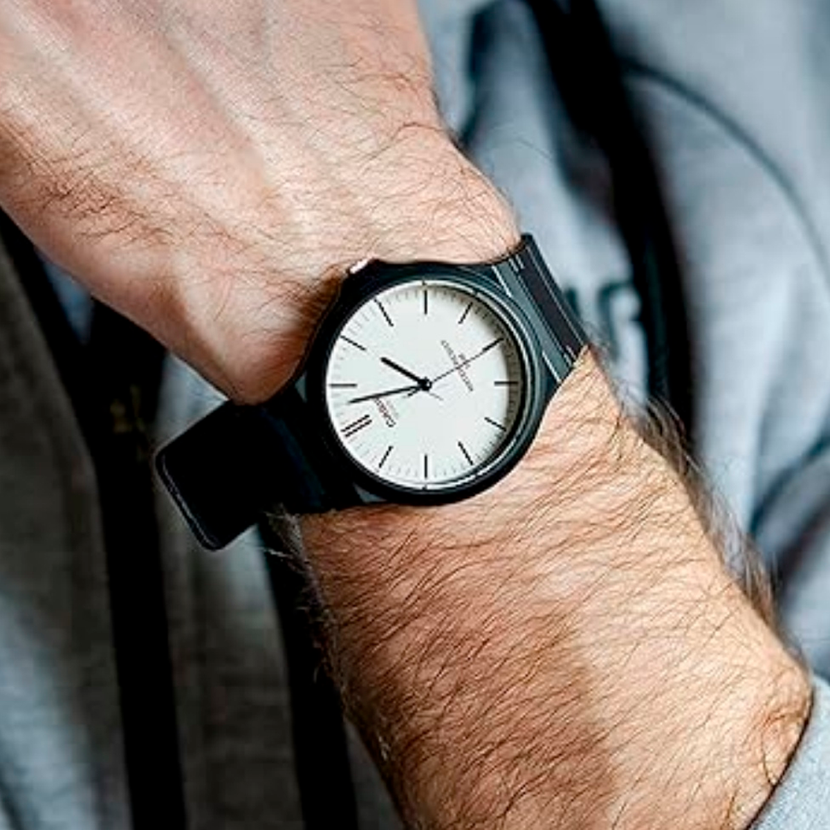 Funciones clásicas de reloj análogo: 3 agujas (hora, minuto, segundo) Vidrio de resina Caja de resina Correa de resina Batería – 3 años – 1 batería Resistencia al agua – el reloj es resistente hasta 50 metros Dimensiones – 48mm x 43.6mm x 10.3 mm Peso – aprox. 35g