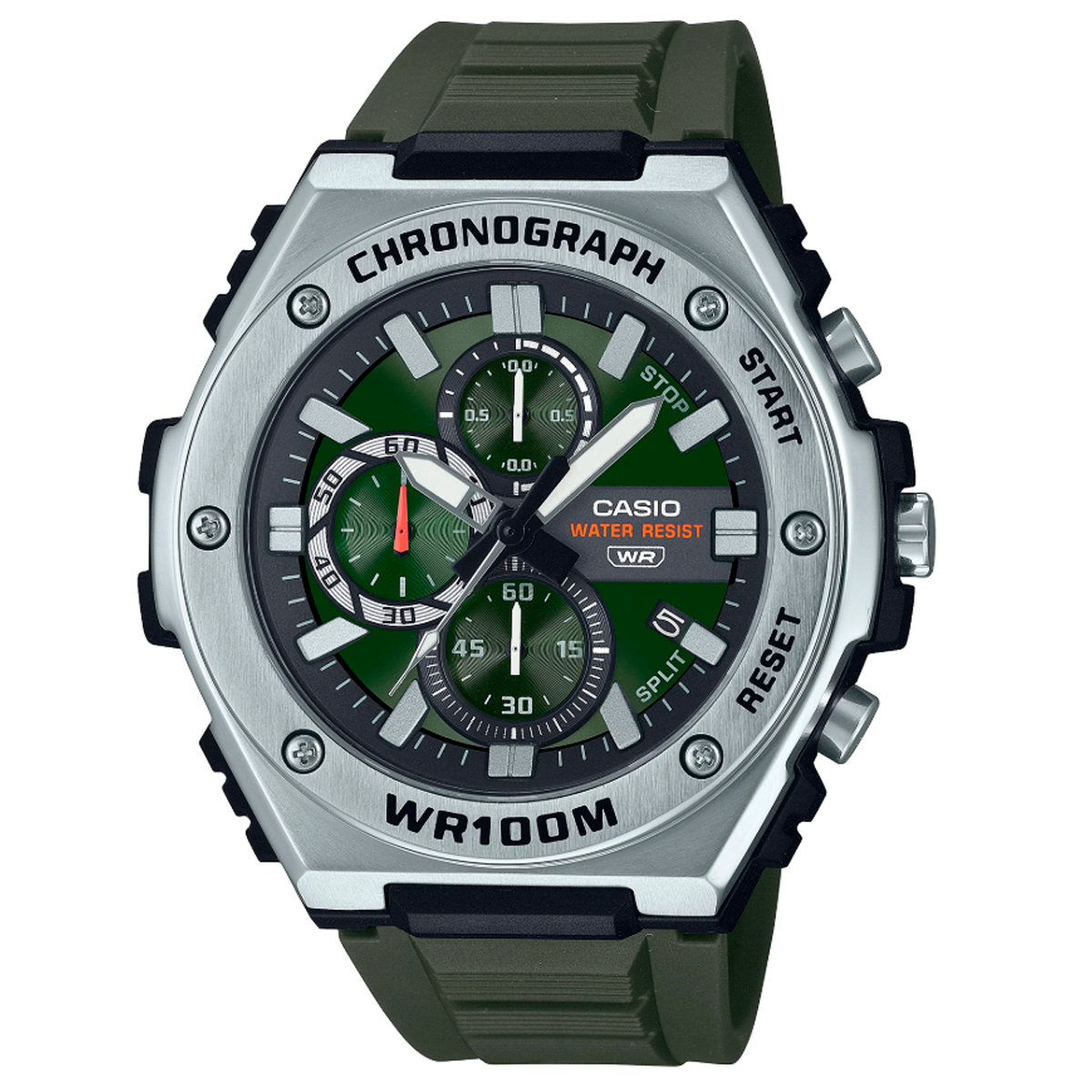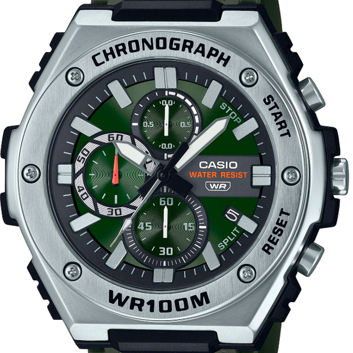 Presentamos un nuevo estilo de cronógrafo: Un reloj analógico multidial con un diseño de metal audaz, pero deportivo. Los acabados de cepillado y espejo del marco metálico le dan a este reloj una textura sofisticada y atractiva, y toques deportivos casuales como los índices elevados y diales insertos y la sutil esfera de rayos de sol son el broche perfecto. Tanto funcionalidad como diseño, resistencia al agua hasta 100 metros, cronómetro y mucho más ofrecen lo que necesita en sus días más activos.