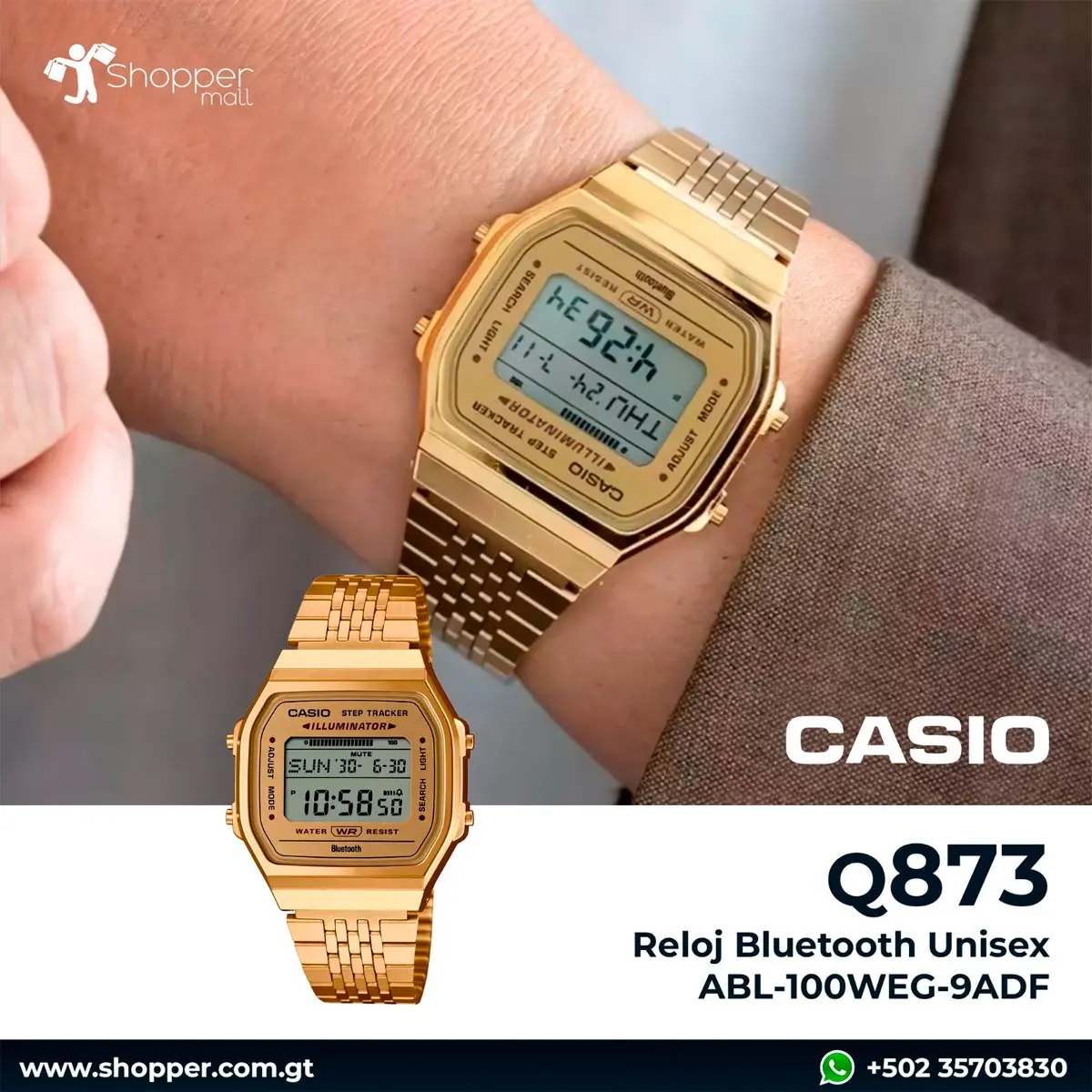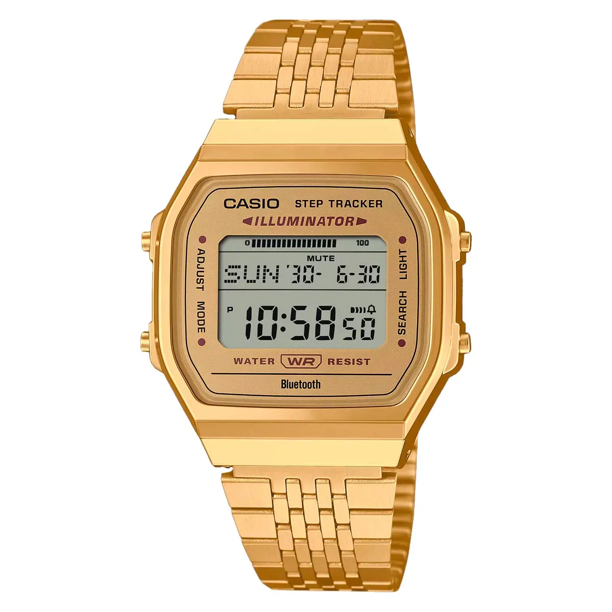 Reloj Bluetooth Unisex ABL-100WEG-9ADF La moda vintage se combina con la funcionalidad moderna, lo que ofrece un estilo retro con funciones actualizadas. Un diseño clásico con un estilo de antaño: la carcasa simple complementa la correa metálica tipo brazalete de múltiples filas con una estructura plana para garantizar un ajuste cómodo. Sin embargo, no se deje engañar por el aspecto vintage. El reloj incluye tecnología superútil para apoyar su estilo de vida saludable. El sensor incorporado detecta los movimientos corporales y cuenta automáticamente los pasos. Compruebe fácilmente la cantidad de pasos que dio ese día en la pantalla LCD. El emparejamiento del teléfono inteligente mediante Bluetooth® proporciona corrección automática de la hora y facilita la configuración de varias funciones desde la aplicación.