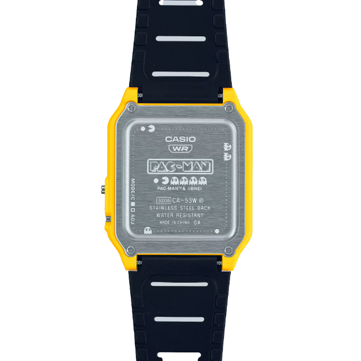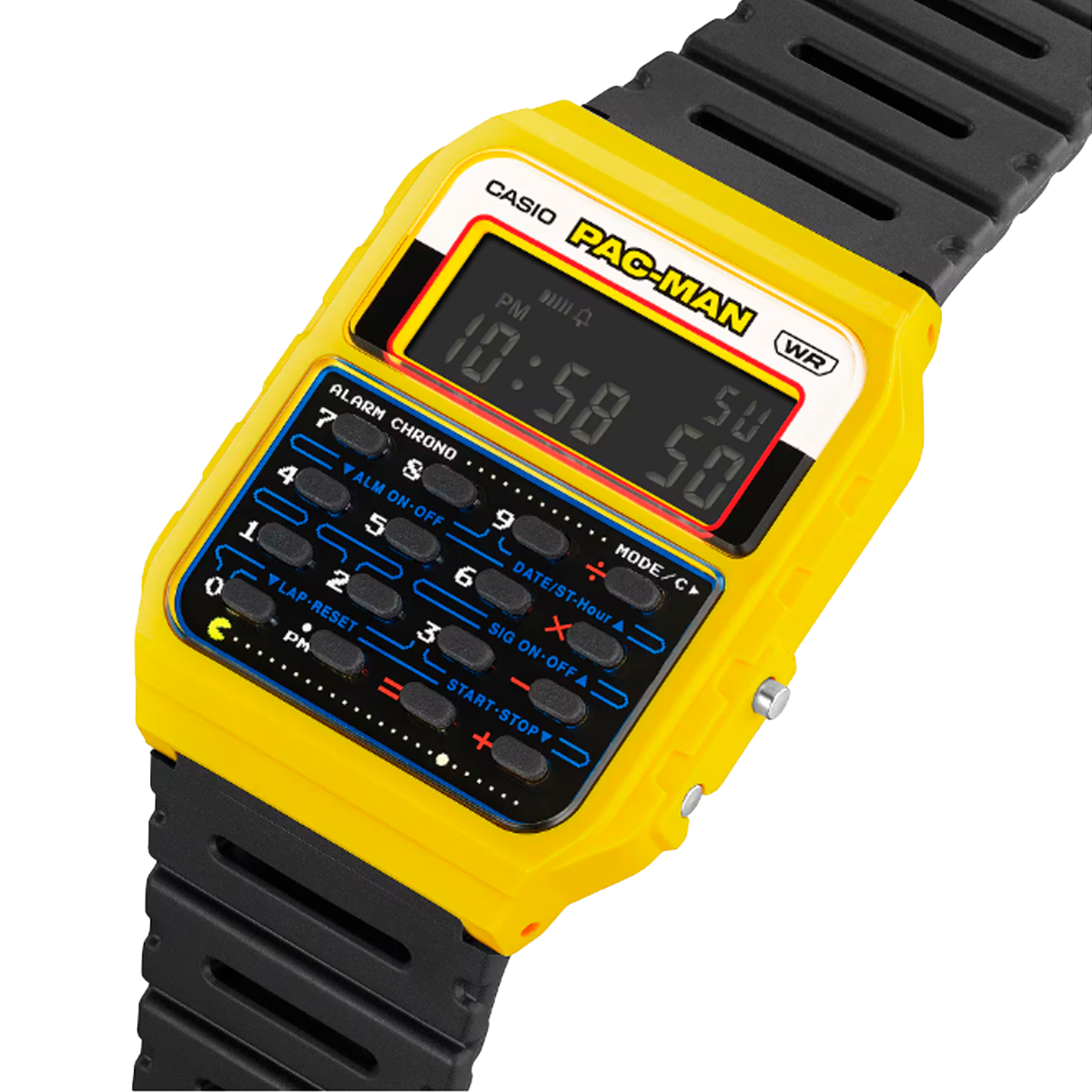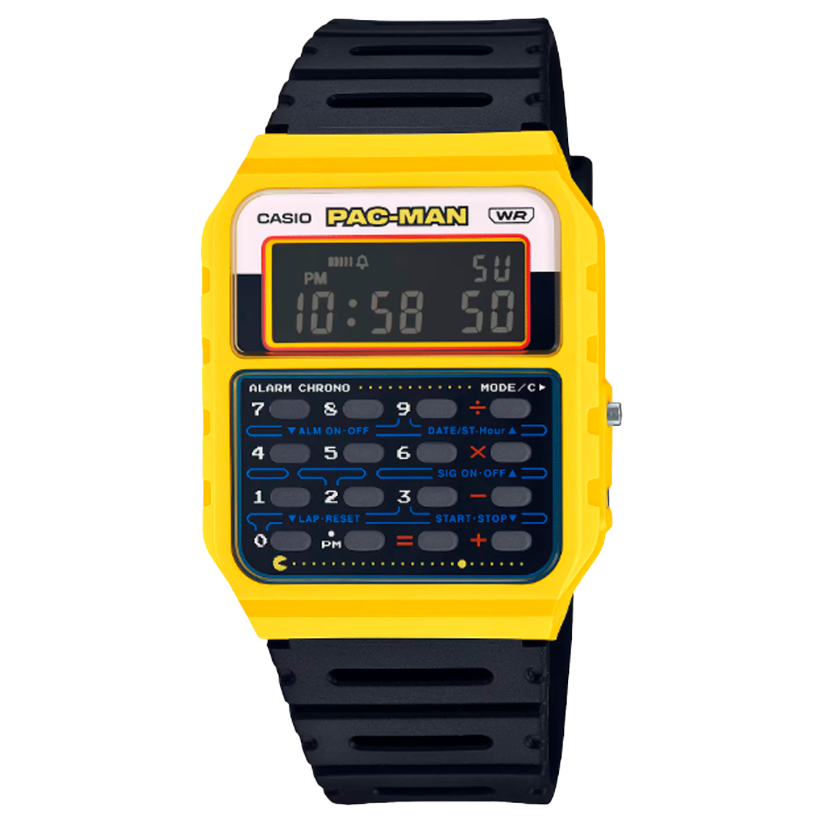 Presentamos toda una colección de colaboraciones especiales en celebración de los 50 años de los relojes Casio y queremos prepararlo para el 45.º aniversario de PAC-MAN en el 2025. Con diseños lúdicos y un toque nostálgico, esta línea da vida al mundo de PAC-MAN, el popular juego de Namco Bandai Entertainment. La esfera del reloj está diseñada para evocar una etapa del juego con los personajes conocidos que corrían por el laberinto en la pantalla, y está delimitada por un marco amarillo que nos recuerda el aspecto de una máquina de juego arcade. La parte posterior de la carcasa tiene grabados los personajes y el logotipo de PAC-MAN. La correa está fabricada con resina de origen biológico, un material que se espera que ayude a reducir el impacto ambiental. Viene en un estuche especial con un diseño de máquina de juegos arcade.