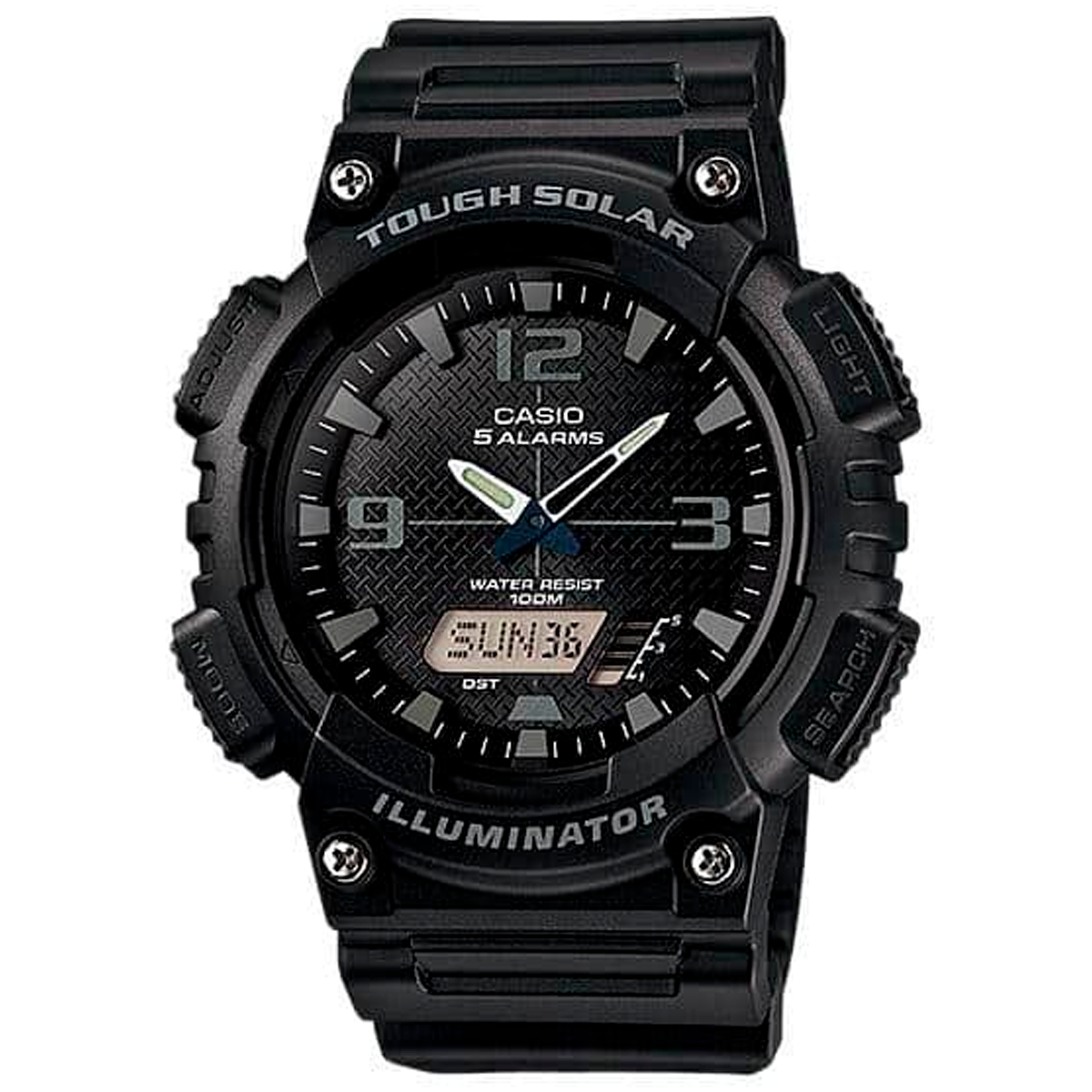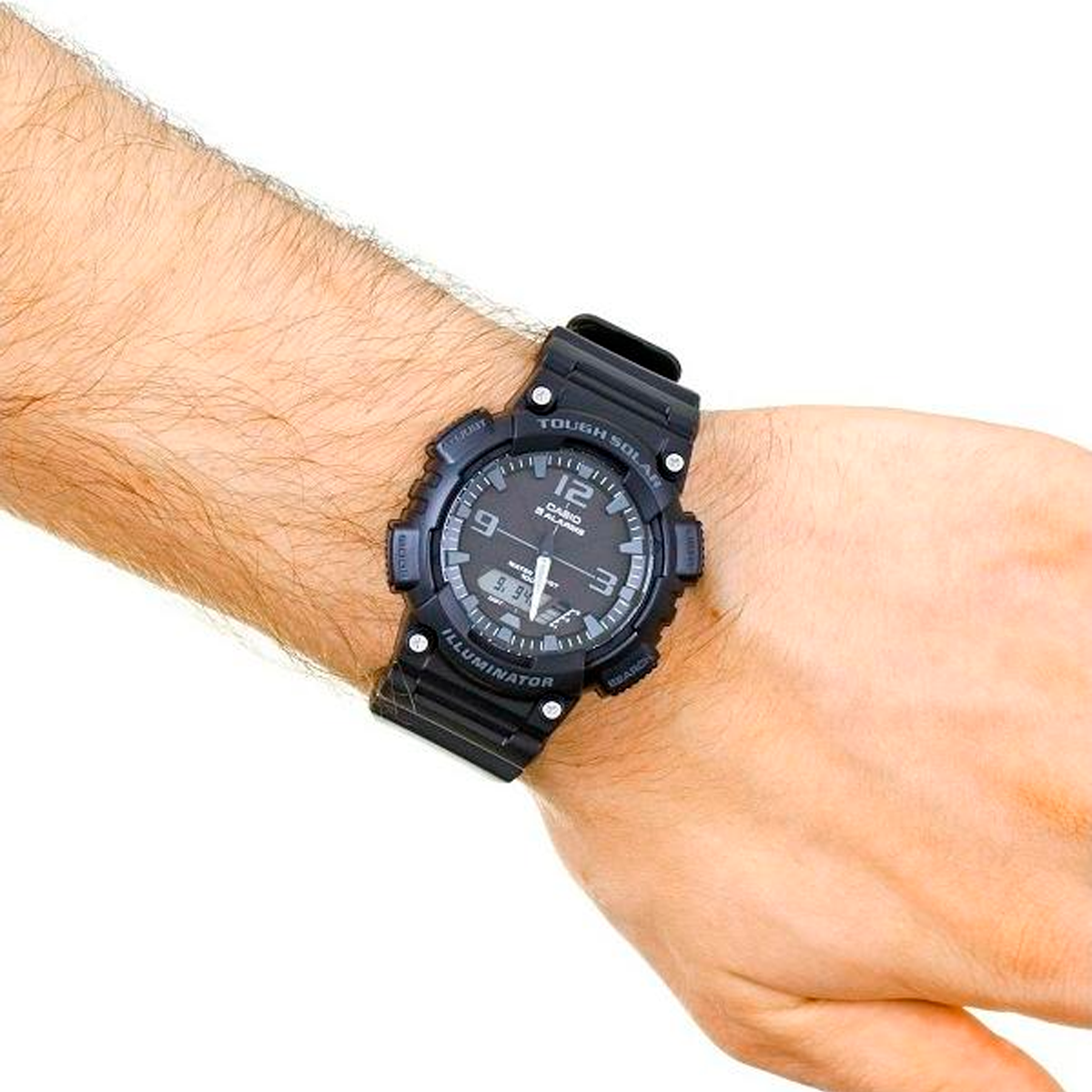 CASIO DE ENERGÍA SOLAR • Tough solar • Hora mundial • Cronómetro de 1/100 segundos • 5 alarmas • Luz LED (solo la parte LCD) • Resistente al agua hasta 100 metros • Diseño deportivo • Indicador del día de la semana en 6 idiomas (inglés, portugués, español, francés, alemán, italiano)