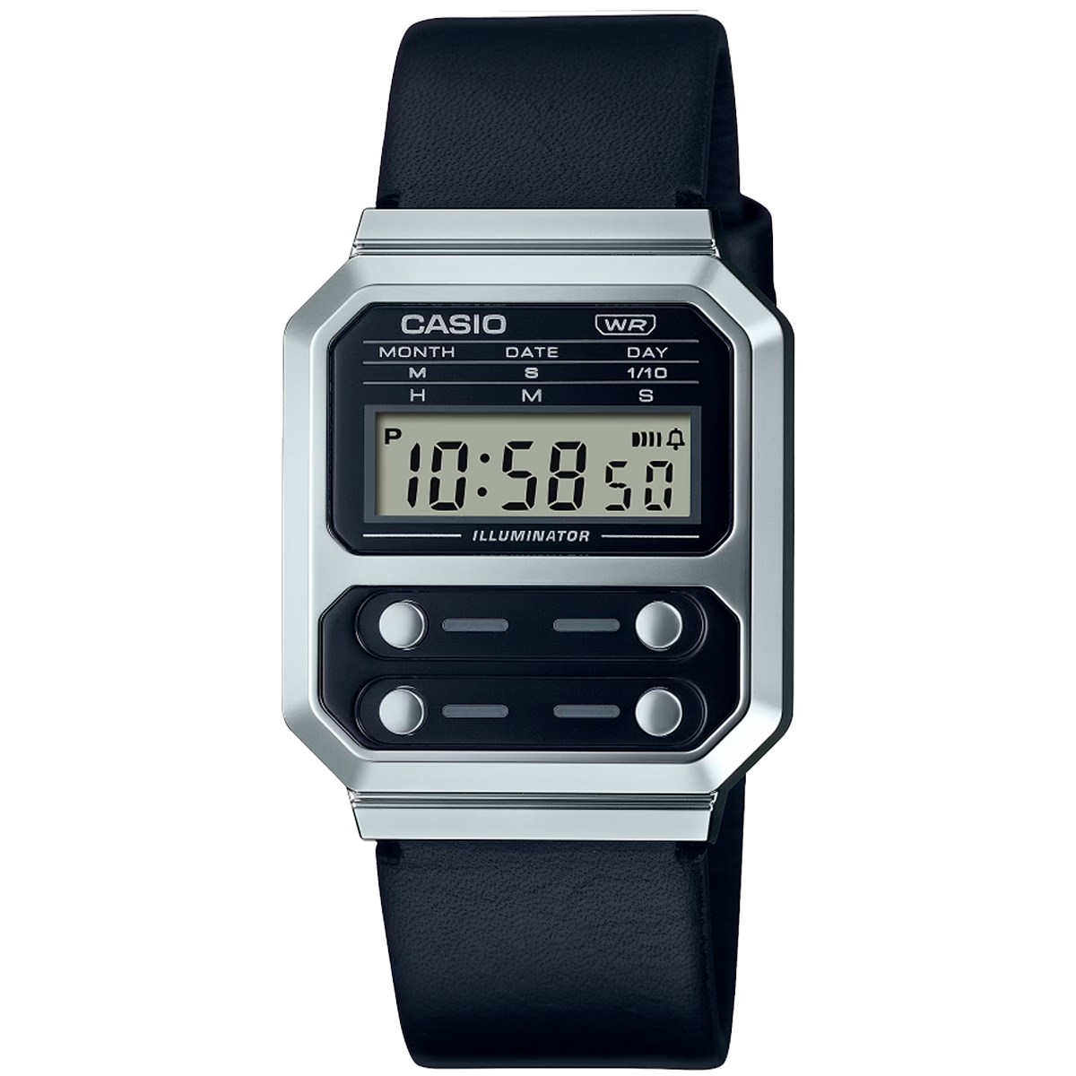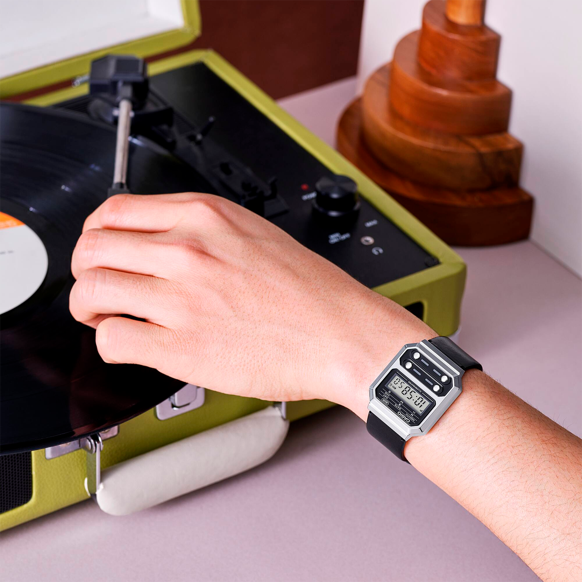 Disfrute de su pasión por todas las cosas retro con una versión monocromática de un reloj Casio tradicional. La línea A-100, que rinde homenaje al F-100, el primer reloj Casio diseñado con una carcasa de resina, conmemora los cuatro botones frontales icónicos y agrega componentes metálicos de estilo retro para una nueva versión actualizada de un verdadero clásico. Retro con estilo, pero con funcionalidades contemporáneas; este reloj cuenta con cronómetro, calendario, resistencia al agua para uso diario y, por supuesto, luz LED a fin de permitir una lectura fácil en cualquier iluminación. Use el broche lateral para modificar fácilmente el largo de la correa y lograr un ajuste perfecto.