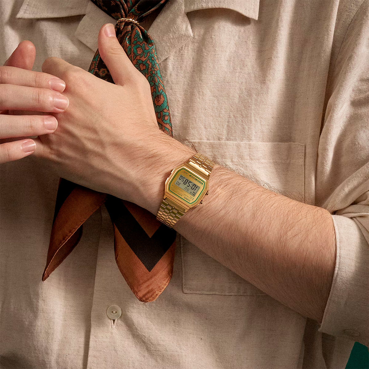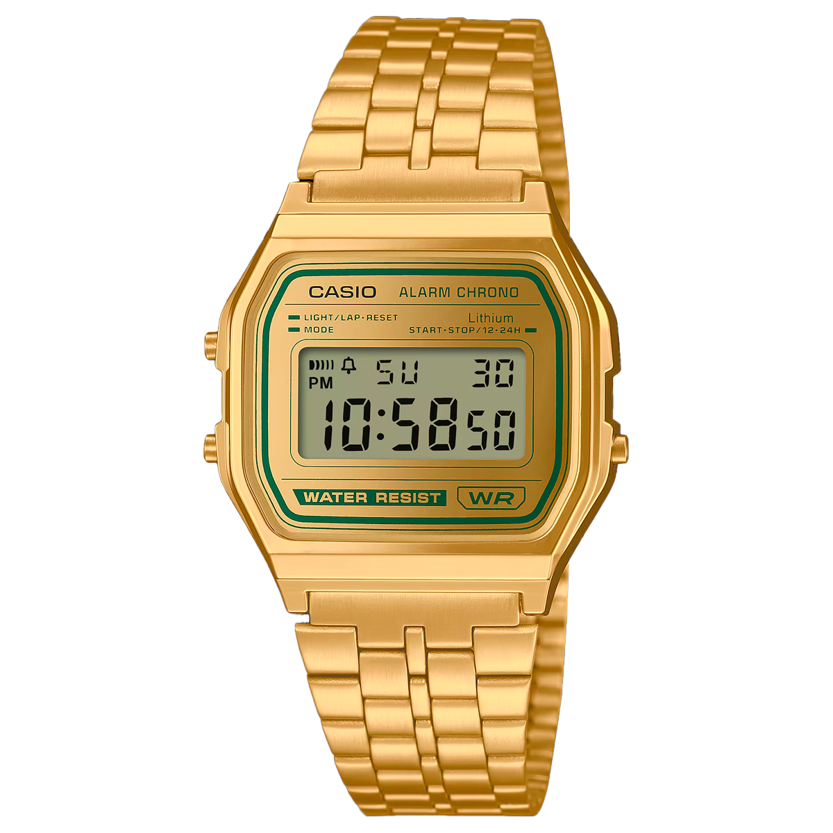 Un toque clásico con un giro moderno. El icónico A158 se reinventa con una llamativa combinación de dorado y acentos verdes. Su diseño unisex lo convierte en una pieza atemporal, ideal para cualquier ocasión. El brazalete metálico de varias hileras presenta un elegante acabado mate, mientras que el cristal, tratado con un revestimiento al vapor, añade un sutil pero deslumbrante brillo. Este reloj no solo destaca por su estilo, sino también por su funcionalidad. Equipado con retroiluminación LED, cronómetro, alarma y más, es la perfecta combinación de moda y practicidad.