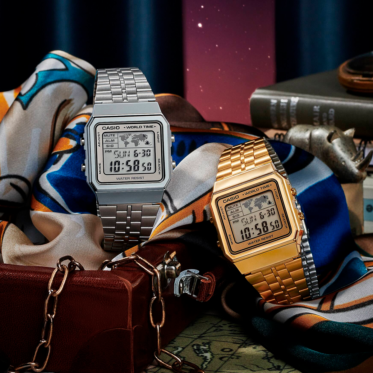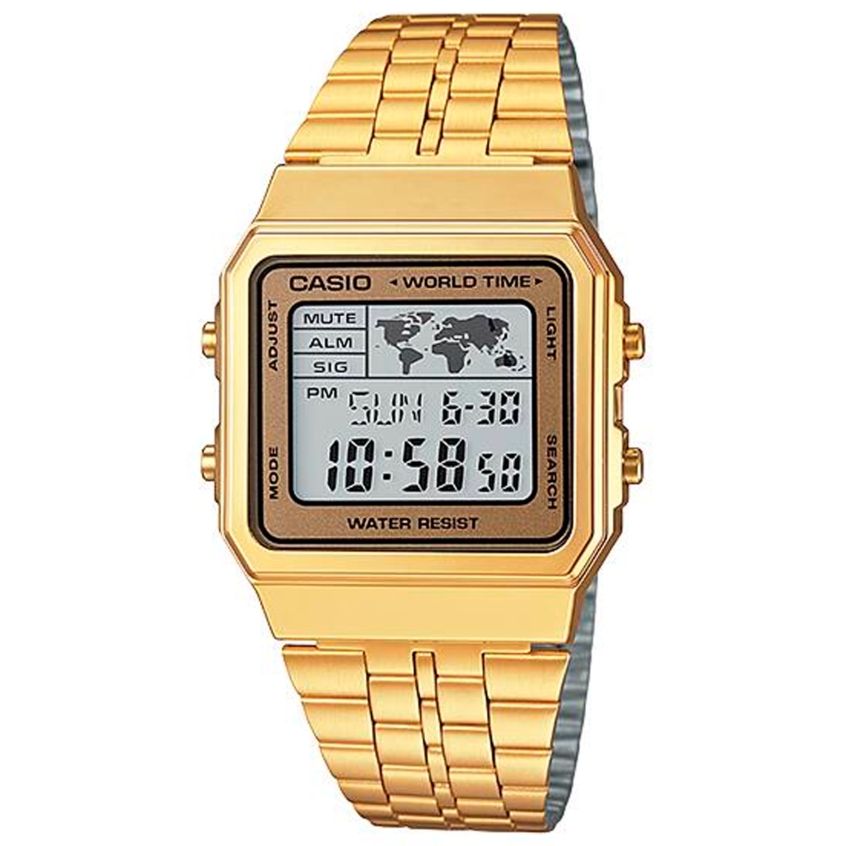 • Resistente al agua • Hora mundial • Visualización de mapa mundial • Luz de fondo LED • 5 alarmas diarias • Cronómetro de 1/100 segundos • Temporizador de cuenta regresiva • Correa de acero inoxidable