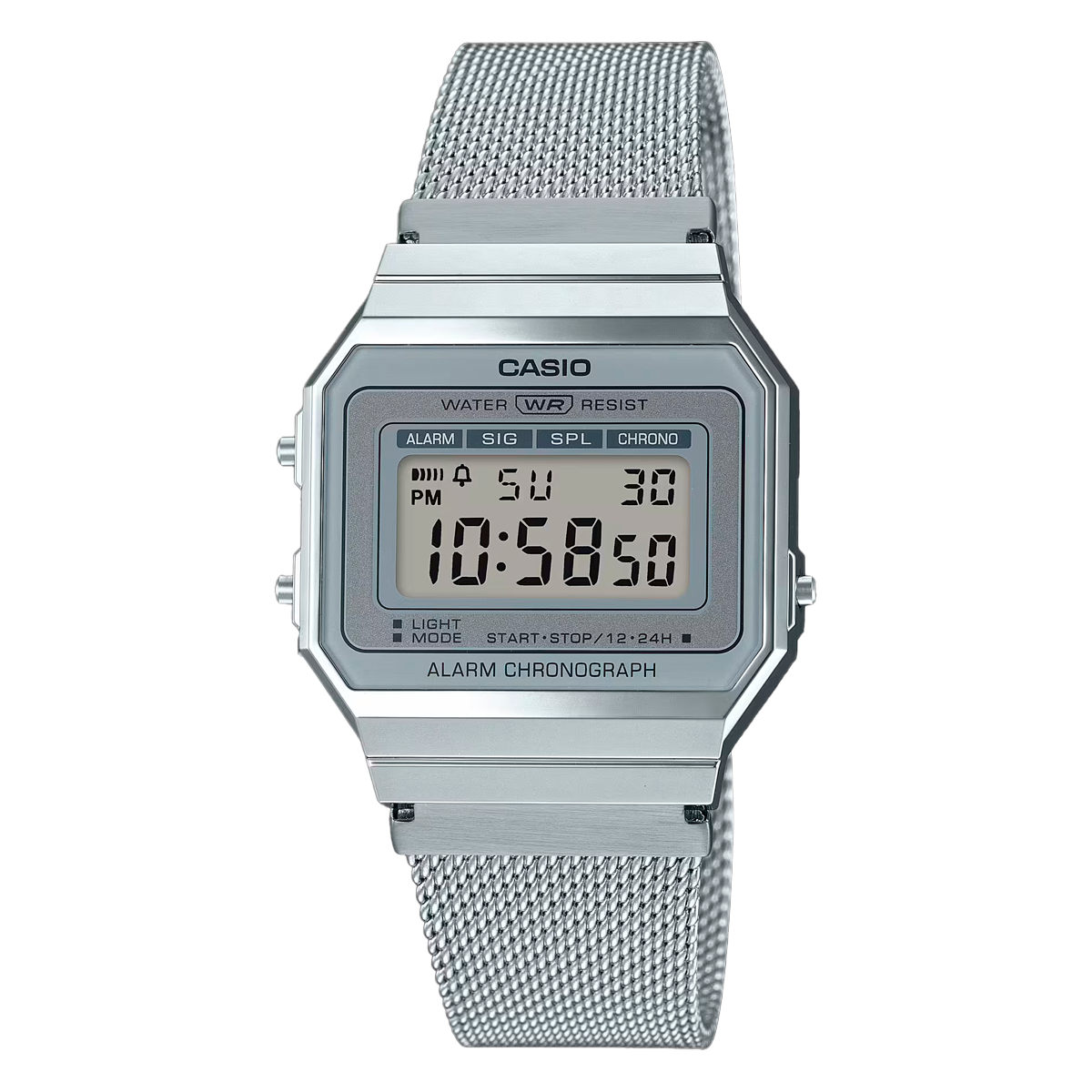 Colección clásica • CARCASA ULTRADELGADA • Resistente al agua • Luz de fondo LED • Cronómetro de 1/100 segundos • Alarma diaria • Correa de acero inoxidable