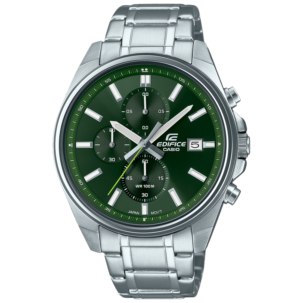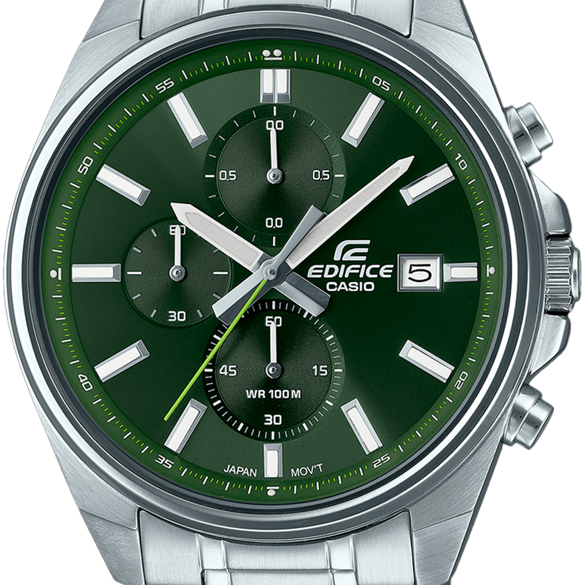 El Casio Edifice EFV-610D-3CV es un reloj análogo de estilo deportivo y elegante, ideal para quienes buscan precisión, resistencia y diseño sofisticado. Su carátula verde con detalles plateados sobre caja y correa de acero inoxidable lo convierte en un accesorio versátil, perfecto tanto para el uso diario como para ocasiones casuales o de trabajo.