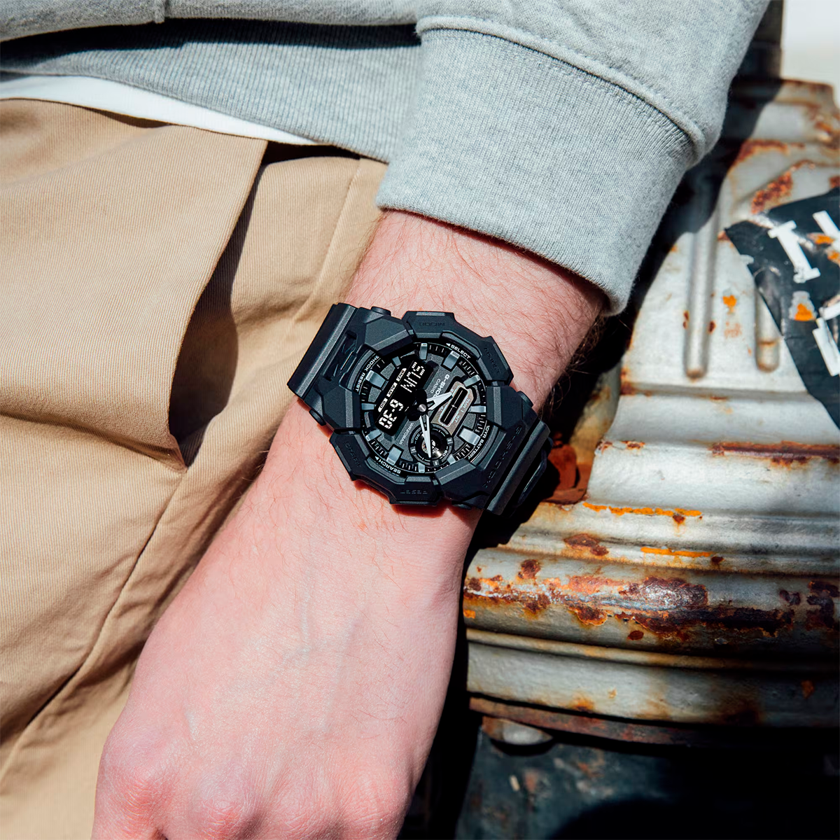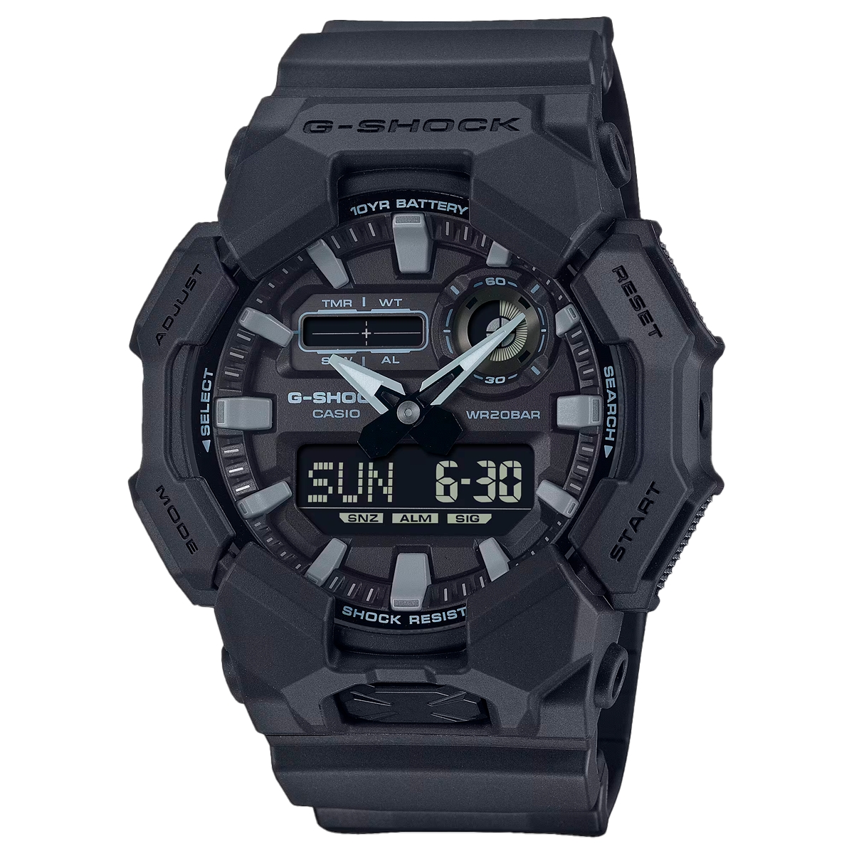 Vive sin preocupaciones de carga con un G-SHOCK de caja grande, que ofrece una batería de 10 años de duración, para que puedas disfrutar sin interrupciones durante mucho tiempo. El GA-010 analógico-digital ofrece funciones prácticas como la hora mundial y el cronómetro, con una pantalla grande y de fácil lectura, además de una caja de gran tamaño. El botón frontal facilita el acceso a la luz LED de alto brillo, lo que facilita la lectura de la esfera, incluso en la oscuridad. Fabricado con resina de base biológica y equipado con una batería de 10 años de duración, este G-SHOCK es perfecto si buscas reducir el impacto medioambiental. Este diseño negro se adapta con facilidad de un estilo informal a un entorno de trabajo.