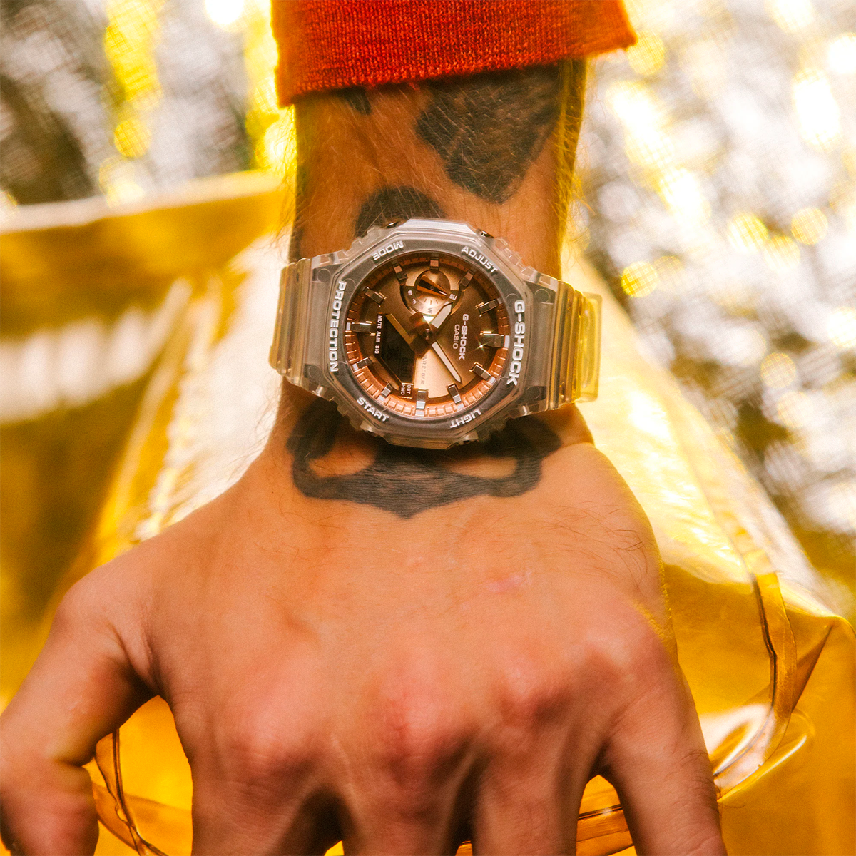 El Casio G-Shock GA-2100BM-7A5 fusiona el icónico diseño octogonal de la serie GA-2100 con un estilo urbano y moderno. Su caja ultrarresistente de resina reforzada con carbono garantiza durabilidad, mientras que la combinación de tonos blanco y cobre metálico en la carátula le da un toque sofisticado y versátil, ideal para cualquier ocasión.