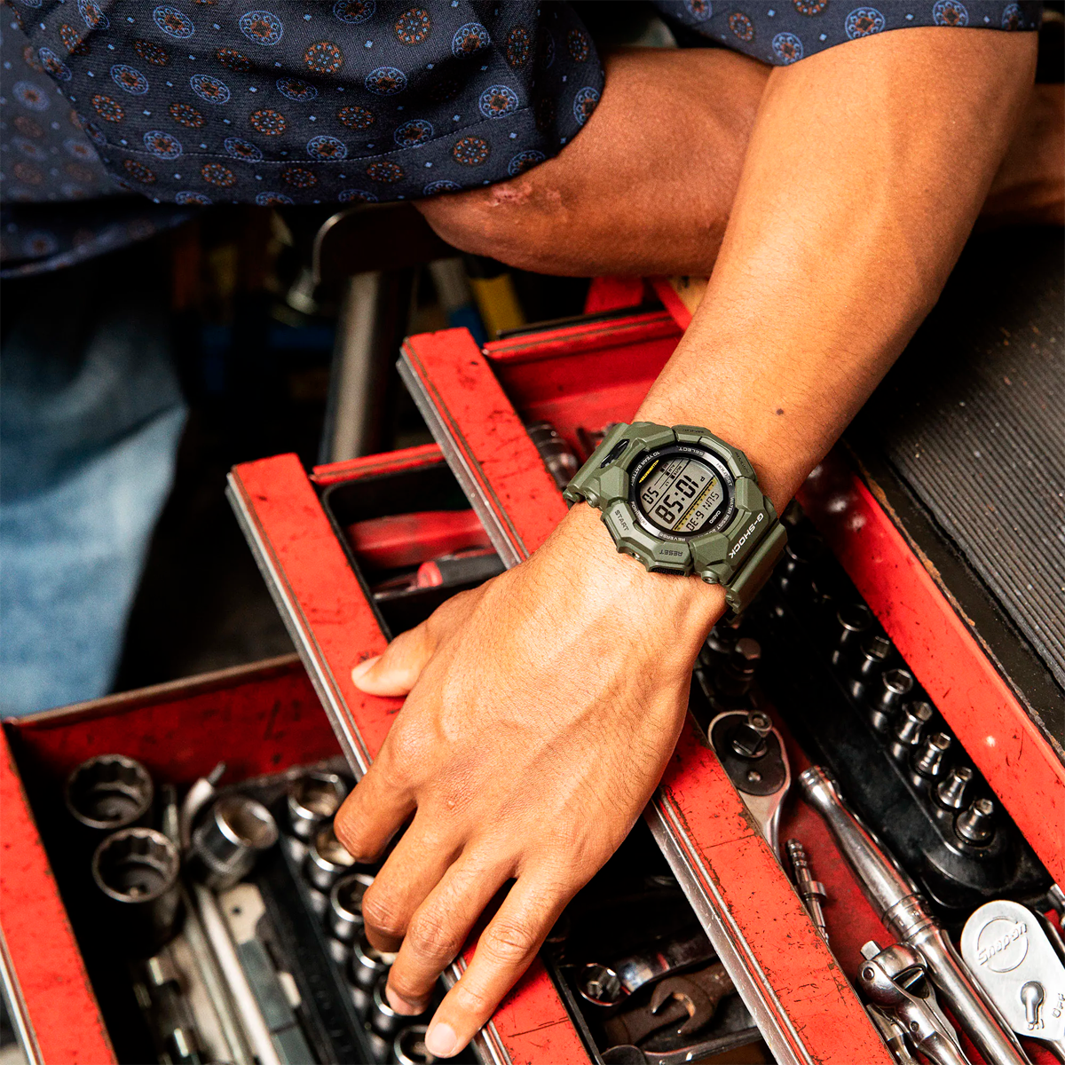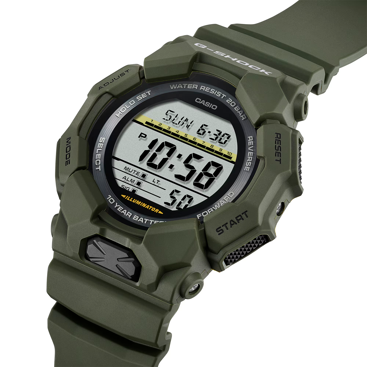 Disfrute de menos cambios de batería con un G-SHOCK de carcasa grande que cuenta con una batería de 10 años por la que no tendrá que preocuparse durante mucho tiempo. El GD-010 digital ofrece funciones útiles como hora mundial y cronómetro, además de una luz LED de alto brillo a la que se puede acceder fácilmente con el botón grande en la parte delantera de la carcasa, lo que garantiza visibilidad incluso en la oscuridad. Fabricado con resina de origen biológico y equipado con una batería de 10 años, este G-SHOCK es ideal si desea reducir el impacto ambiental. Disponible en una selección de esquemas de colores propios de un estilo laboral con una base negra para disfrutar de un diseño genial que se puede utilizar en entornos informales y en el lugar de trabajo.