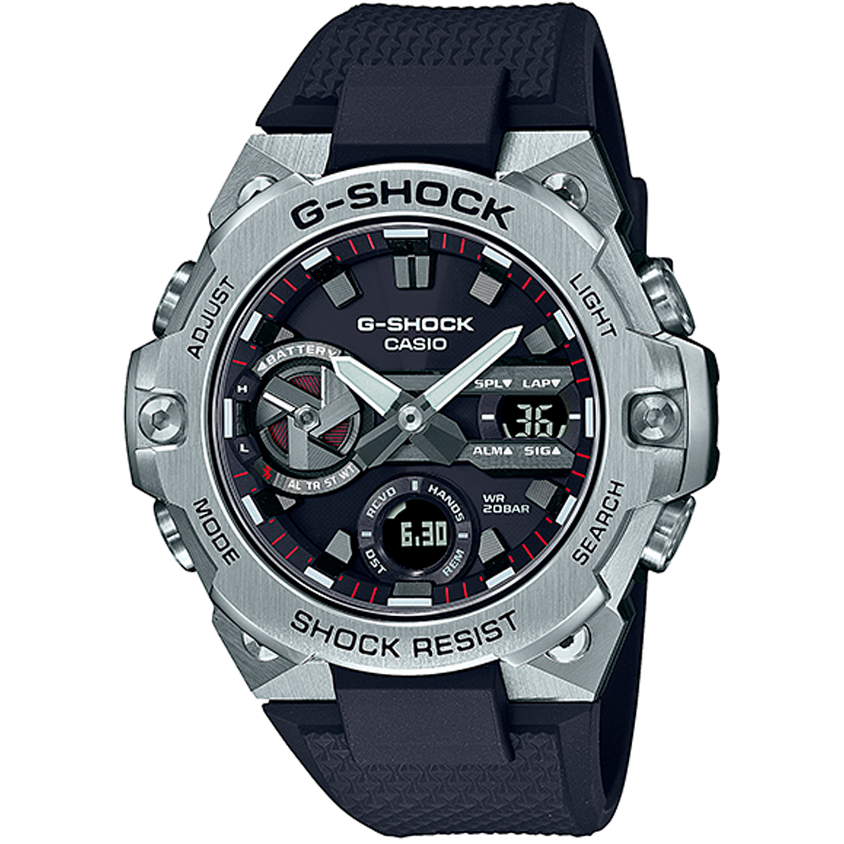Un módulo ultradelgado y revestido con fibra de carbono contribuye a un elegante reloj G-STEEL con el perfil más delgado hasta el momento. La estructura de protección de carbono resistente pero ligera absorbe los impactos externos y conserva la conectividad Bluetooth y la funcionalidad de energía solar, incluso con componentes más pequeños y un módulo más delgado. Con solo 12,9 mm desde la parte posterior de la carcasa hasta la parte superior del marco, el GST-B400 es más de un milímetro más delgado que su predecesor. Puede elegir entre cuatro estilos distintivos: la simplicidad de una correa de metal y una carcasa plateadas; una carcasa de color plateado claro con una correa de resina oscura; un dial con un espectacular acabado de deposición de vapor rojo y un marco con baño de iones negro; o un dial con un llamativo acabado de deposición de vapor azul con un marco y correa con baño de iones negro. Con marcos superiores tratados con cinco acabados diferentes y marcos intermedios tratados con cuatro, estos relojes G-STEEL proporcionan texturas metálicas excepcionales desde todos los ángulos. * El perfil más delgado hasta diciembre del 2020