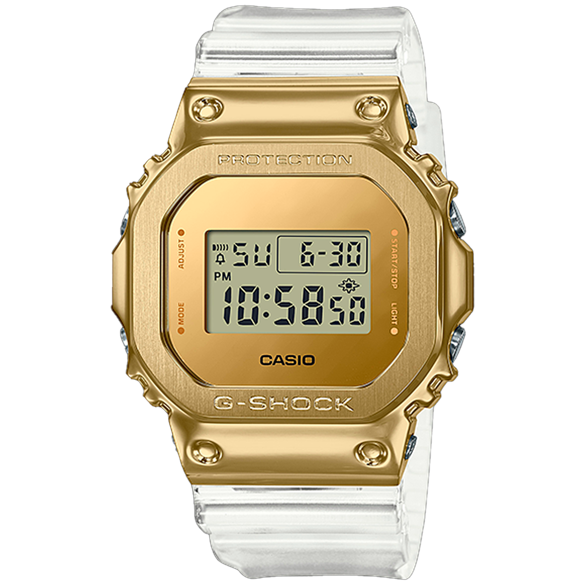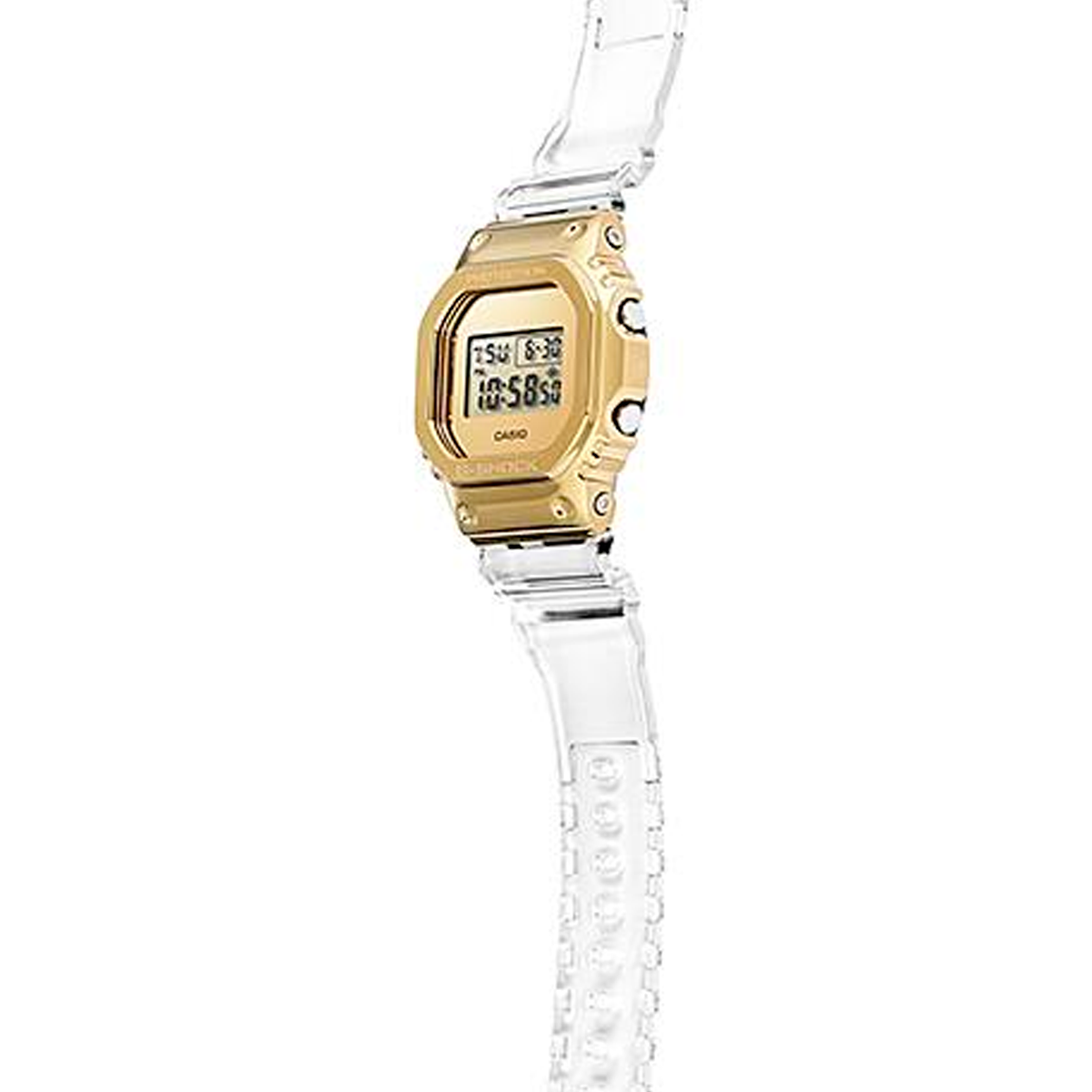 De G-SHOCK, los relojes que evolucionan en la búsqueda de resistencia, esta serie de rígidos y modernos marcos de acero inoxidable diseñados con un lingote de oro como motivo. Si bien el modelo base mantiene conceptos heredados de la primera generación, se utilizó un GM-5600 refinado para proporcionar calidad al reloj y evolucionar el exterior y la facilidad de uso. La correa está elaborada de resina transparente clara para complementar el reloj dorado, lo que da como resultado un diseño sofisticado y moderno. Un lujoso G-SHOCK que le proporciona el color del oro a la línea con cubierta metálica.