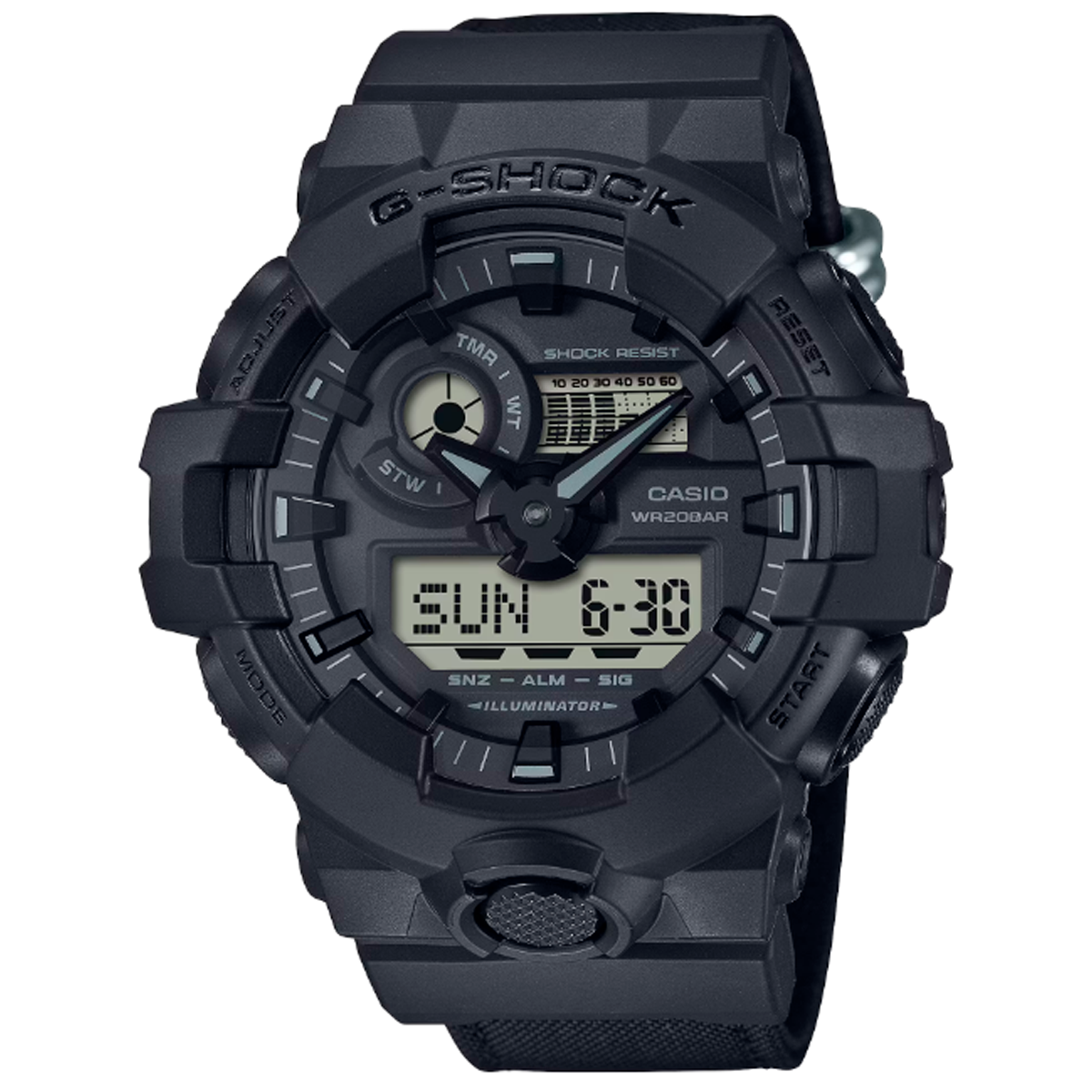 Este G-SHOCK con correa de nailon Cordura, práctico para la calle y ecológico al mismo tiempo, ofrece todo lo que necesita. El moderno diseño completamente negro se complementa con una correa hecha de nailon Cordura ecológico, lo que crea un aspecto fresco y versátil que le permite alternar sin problemas entre el trabajo y el ocio. Elija entre tres modelos: el icónico DW-5600, el GA-2100 con marco octagonal o el GA-700 de carcasa grande.