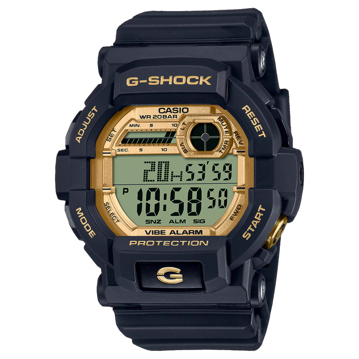 Pase de fuerza a fuerza con un G-SHOCK en la popular y confiable combinación de colores negro y dorado. No se perderá nada con el GD-350. Controle fácilmente la hora durante la noche y bajo el agua con una función de temporizador y alarma que no solo emite pitidos y parpadeos cuando se acaba el tiempo o suena la alarma, sino que también vibra. La parte posterior de la carcasa está equipada con amortiguadores para mejorar el ajuste y la transmisión de vibraciones a la muñeca. La ventana indicadora superior derecha evoca el visor de un radar submarino y los detalles en color dorado agregan el toque final.