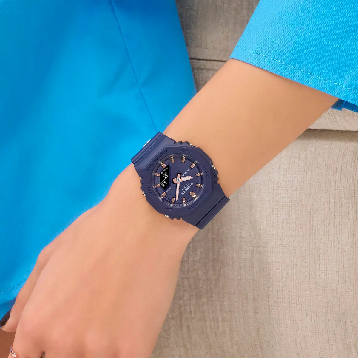 Lleve su amor por el aspecto analógico-digital siempre popular del G-SHOCK al siguiente nivel con un toque brillante de colores nuevos. El GMA-P2100 cuenta con índices elegantes con acabado de oro rosa por deposición de vapor y un diseño compacto para calzar en muñecas pequeñas con total comodidad. Los componentes clave de la correa están fabricados con resina de origen biológico. Se espera que este material, producido con recursos orgánicos renovables, ayude a reducir el impacto ambiental. Elija su favorito entre tres colores versátiles que calzan con cualquier traje en cualquier estación del año: azul marino, rosa beige o blanco. Agregue un brillo de individualidad con un toque de oro rosa brillante en su muñeca.