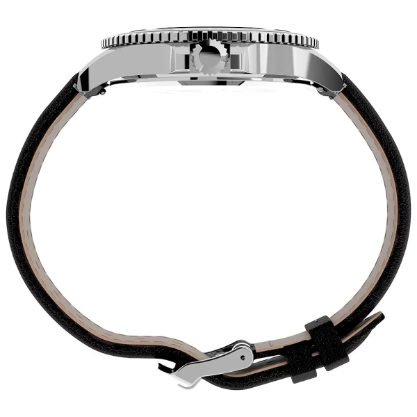 Nuestro reloj multifunción Harborside de 42 mm eleva los temas costeros con artesanía y detalles. El aluminio anodizado está incrustado en el anillo superior negro con borde festoneado, creando una apariencia pulida. Las manecillas del reloj se completan con pintura luminiscente y las complicaciones muestran el día, la fecha y la hora de 24 horas. Una correa de cuero natural cosida en negro se sujeta con barras de resorte de liberación rápida.