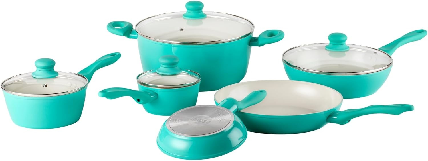 - REVESTIMIENTO CERaMICO: Hecho de aluminio forjado con revestimiento ceramico marfil y exterior verde azulado, este juego presenta un diseno elegante y proporciona una facil limpieza con su superficie antiadherente