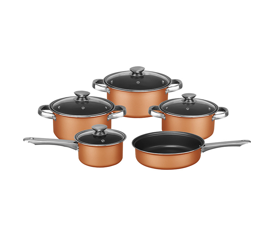 Set de olla de cocina con revestimiento de cobre antiadherente de 9 piezas con tapas de vidrio.