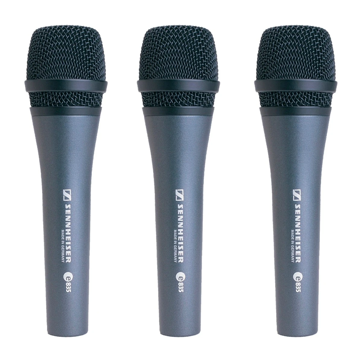 El paquete e835 THREE PACK de Sennheiser es un paquete de tres micrófonos dinámicos cardioide e835-S conmutados en un paquete de valor agregado. Estos micrófonos de mano robustos ofrecen un excelente rechazo de la retroalimentación, un efecto de proximidad mínimo y un suave impulso de presencia para mayor claridad. Pueden ser utilizados para hablar, voces, conferencias, y mucho más. El micrófono e835 está equipado con un interruptor de encendido / apagado silencioso y salida XLR, y es una opción popular para casas de culto, escenarios, presentaciones o conferencias donde la inteligibilidad del habla es crítica. Además, el e835-S THREE PACK de Sennheiser proporciona un clip de micrófono para cada micrófono y bolsas de transporte.