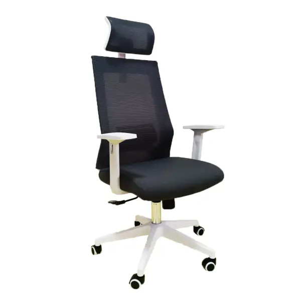 Estructura y base blanca, apoyacabeza y respaldo lumbar ajustable, apoyabrazos fijos, reclinable, Tapizada en tela en el asiento y respaldo de mesh color negro, Cómoda y fresca.
