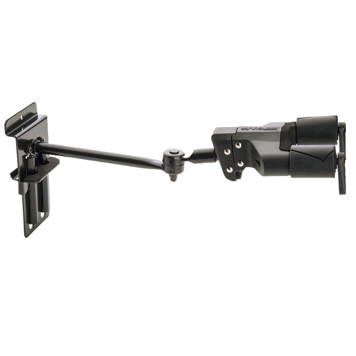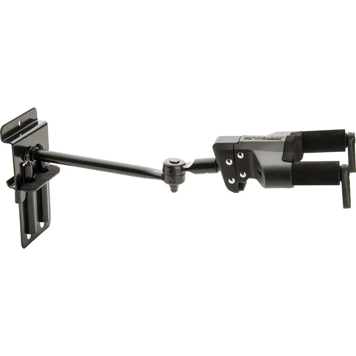 El colgador de horquilla ajustable y giratorio automático HERCULES GSP50SB PLUS gira para adaptarse a la mayoría de las guitarras y gira hacia la izquierda o la derecha para que pueda exhibir el instrumento en varias direcciones. Cuenta con una base de listones para uso como soporte de exhibición.